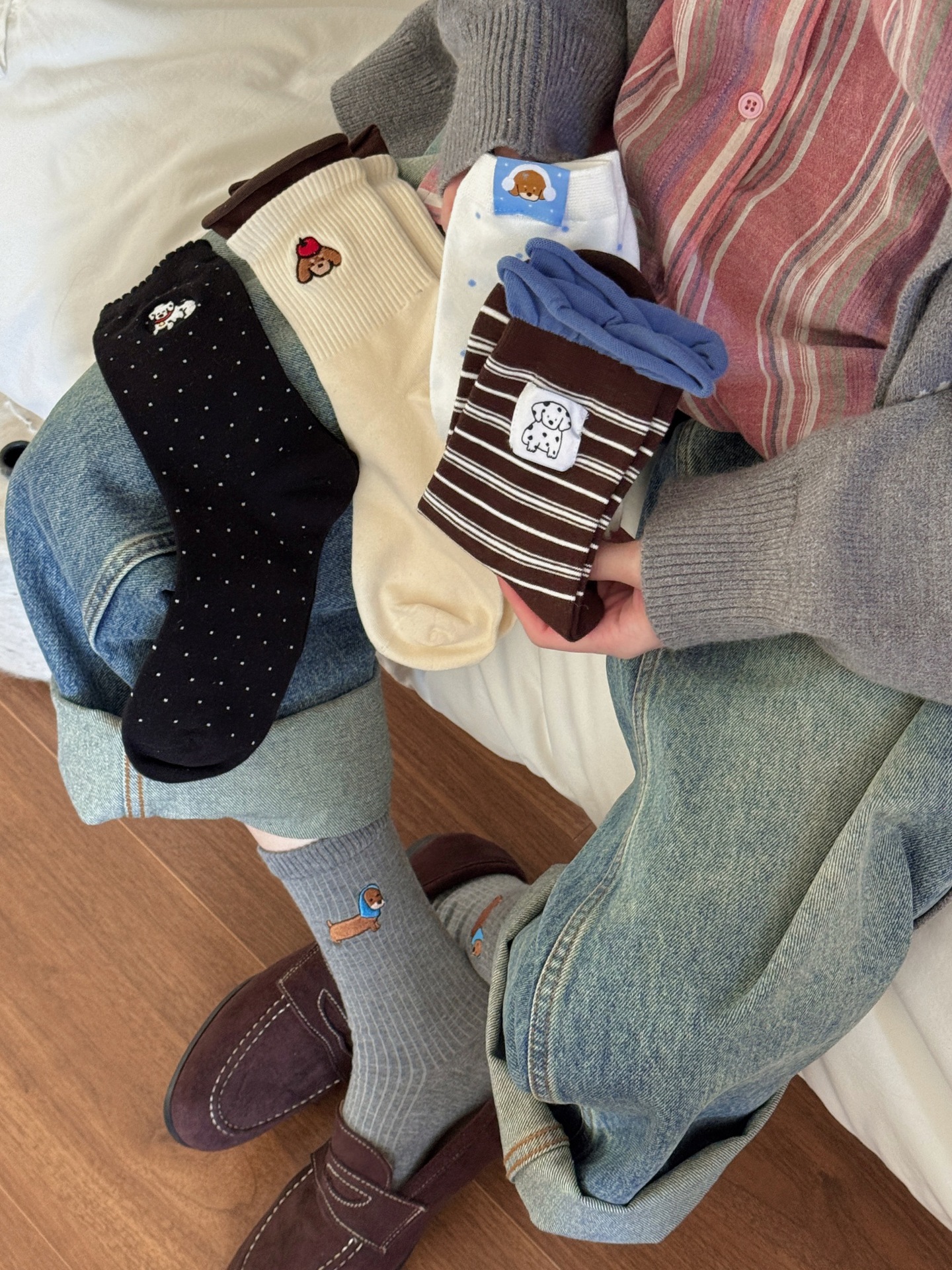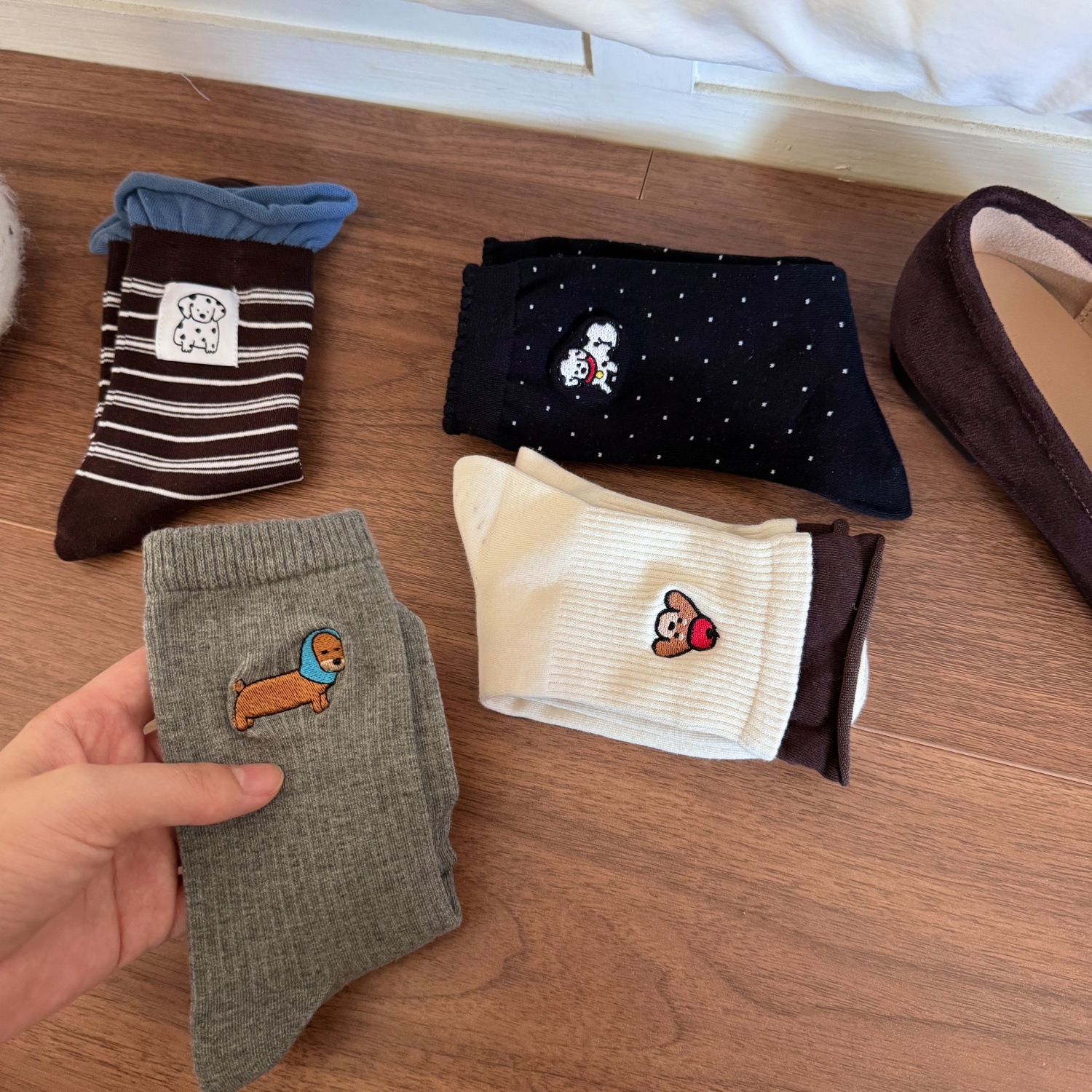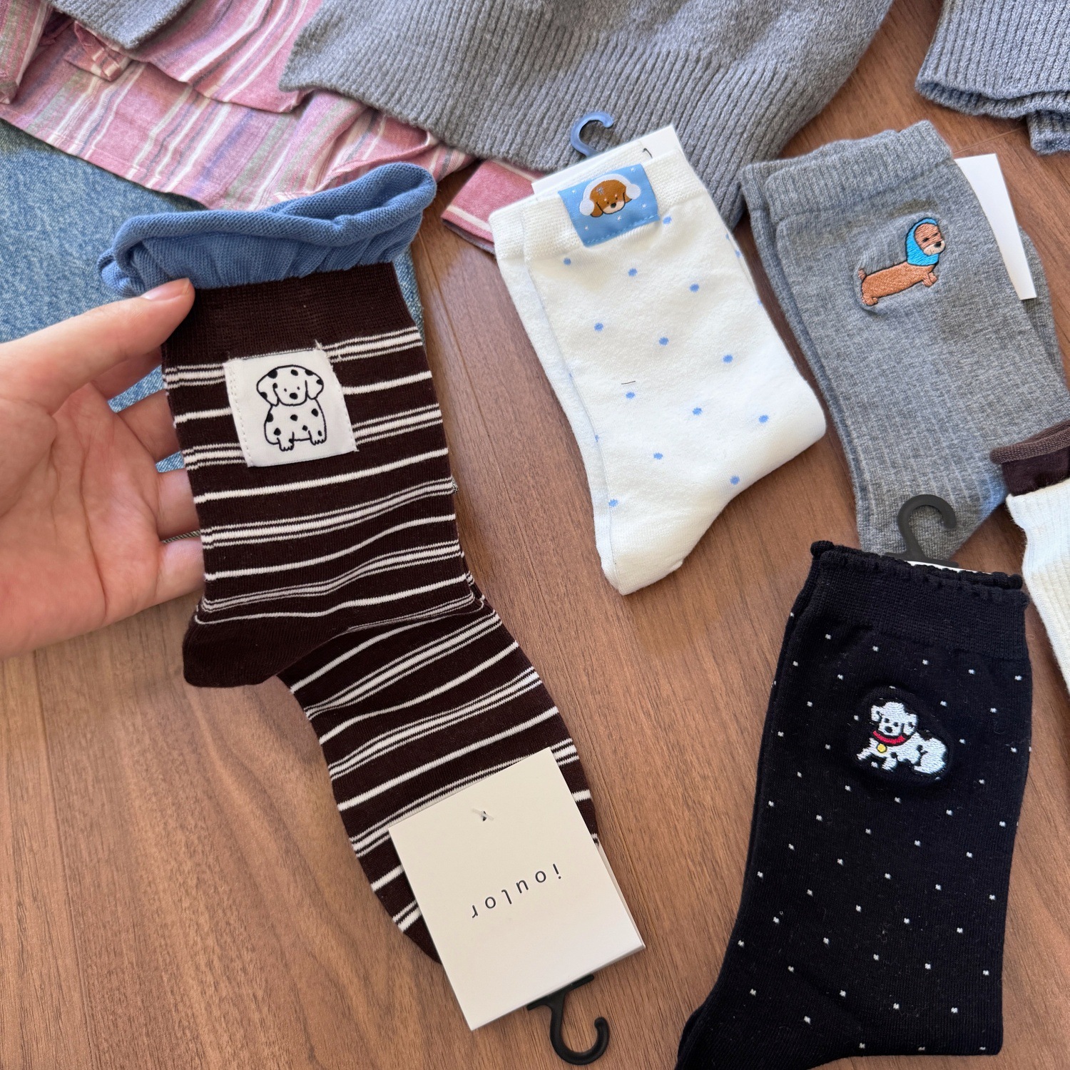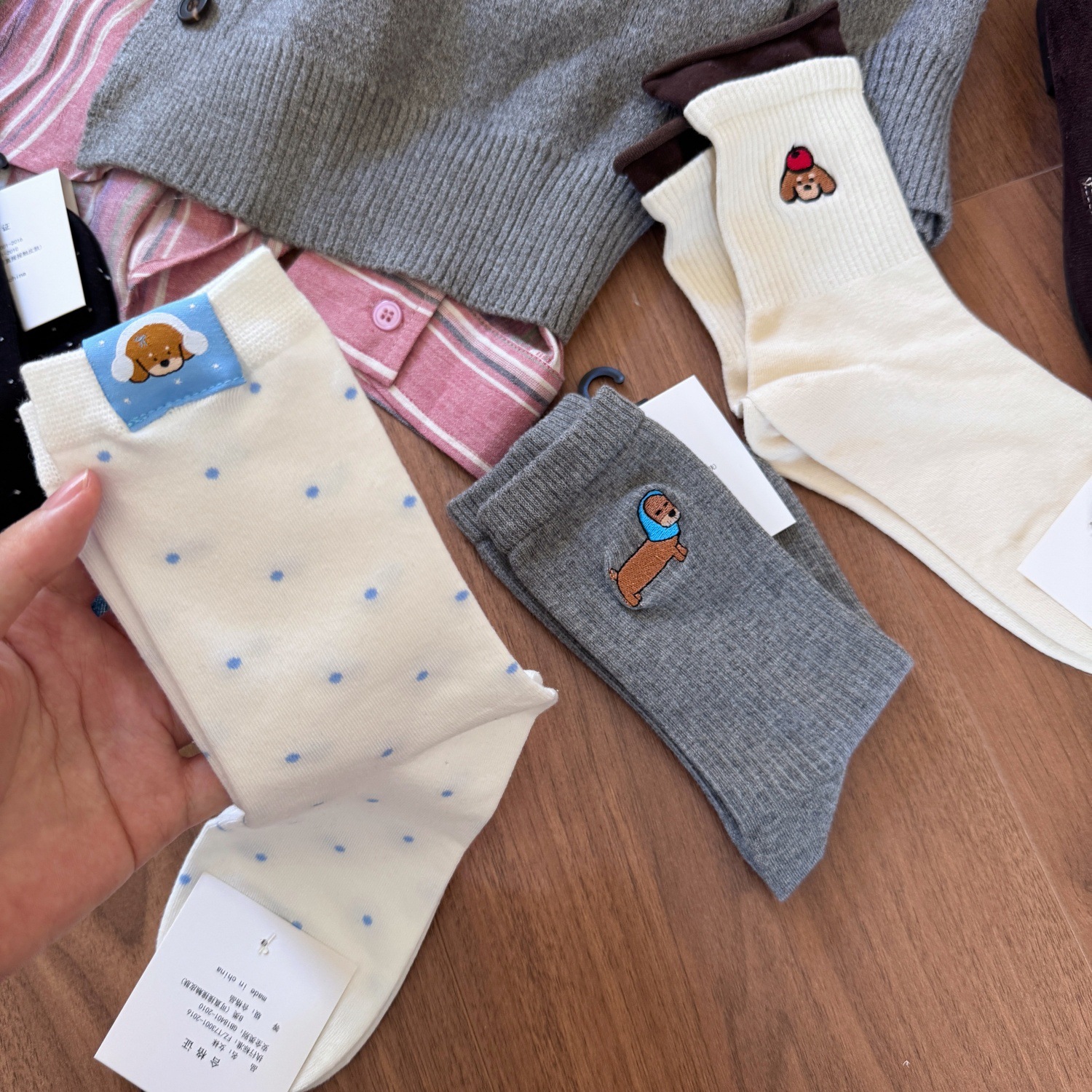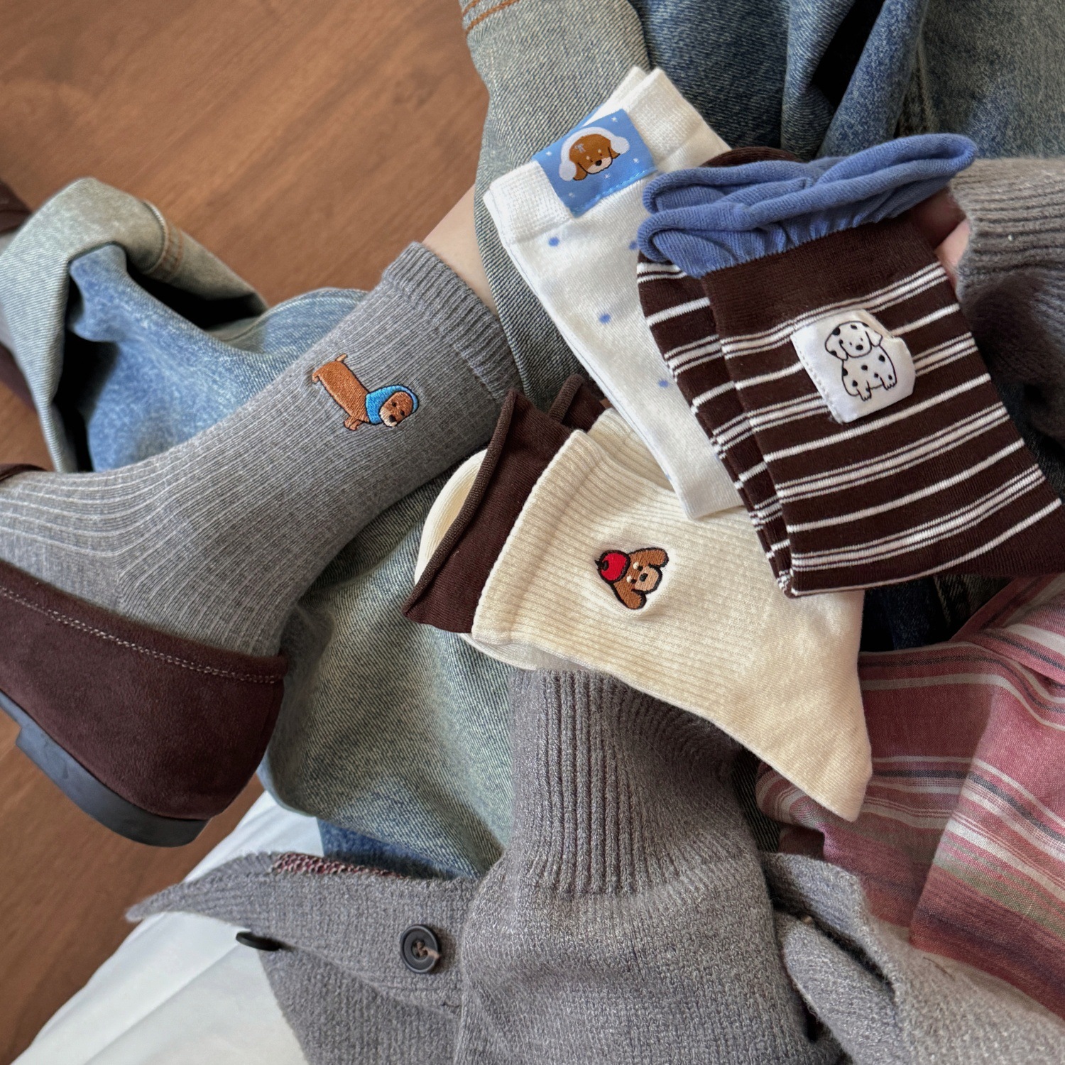 秋冬超舒服的羊绒袜子女腊肠小狗刺绣波点中筒羊毛袜保暖堆堆袜女
