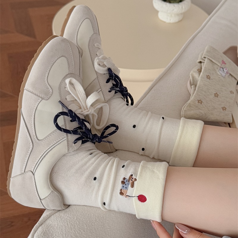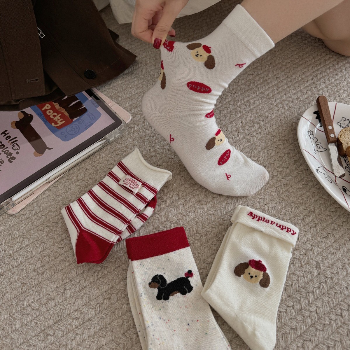 可爱袜子女纯棉白色苹果小狗中筒袜ins潮日系卡通学院风长袜秋天