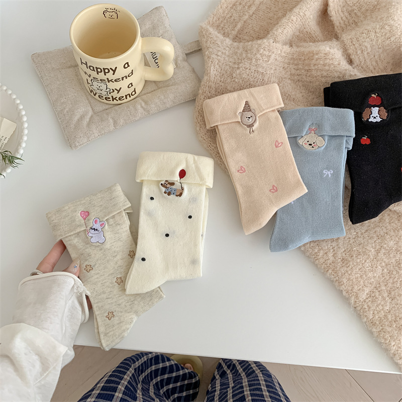 可爱翻边卡通刺绣袜子女日系腊肠狗ins纯棉中长筒堆堆袜诸暨袜子