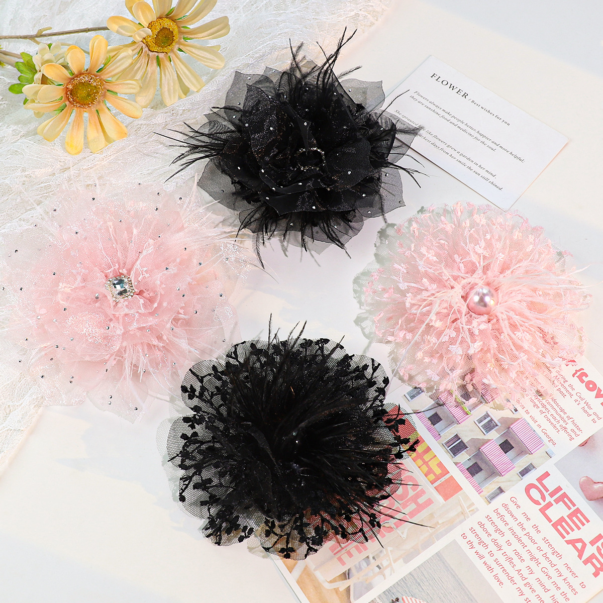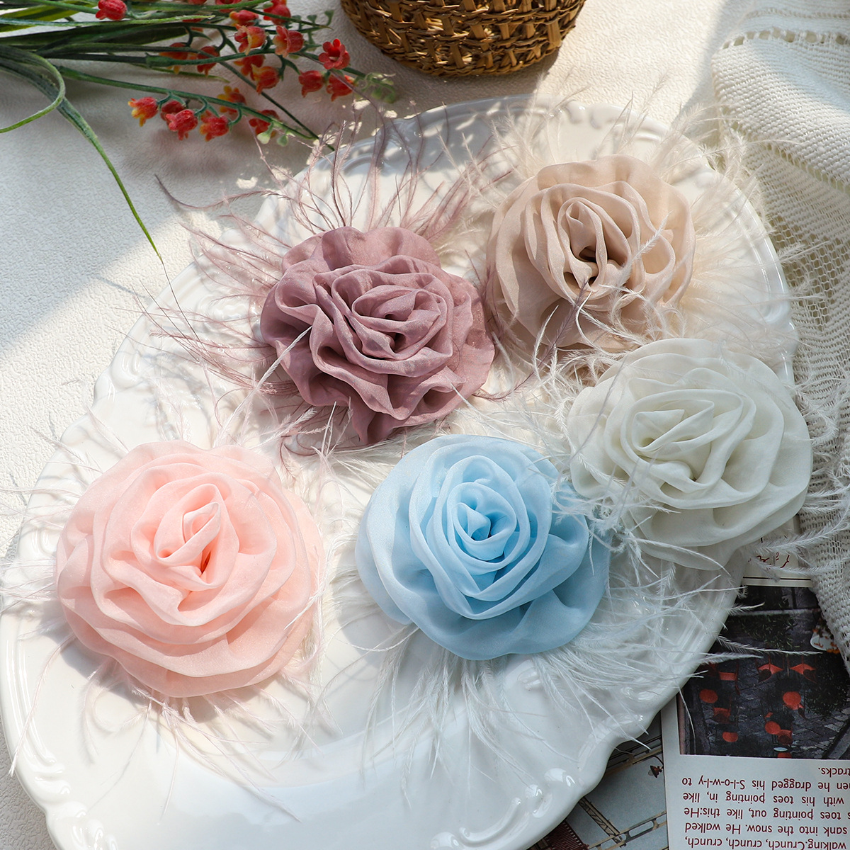 秋冬新款欧根纱卷心花花朵羽毛diy服装辅料鸵鸟毛头饰配件胸花