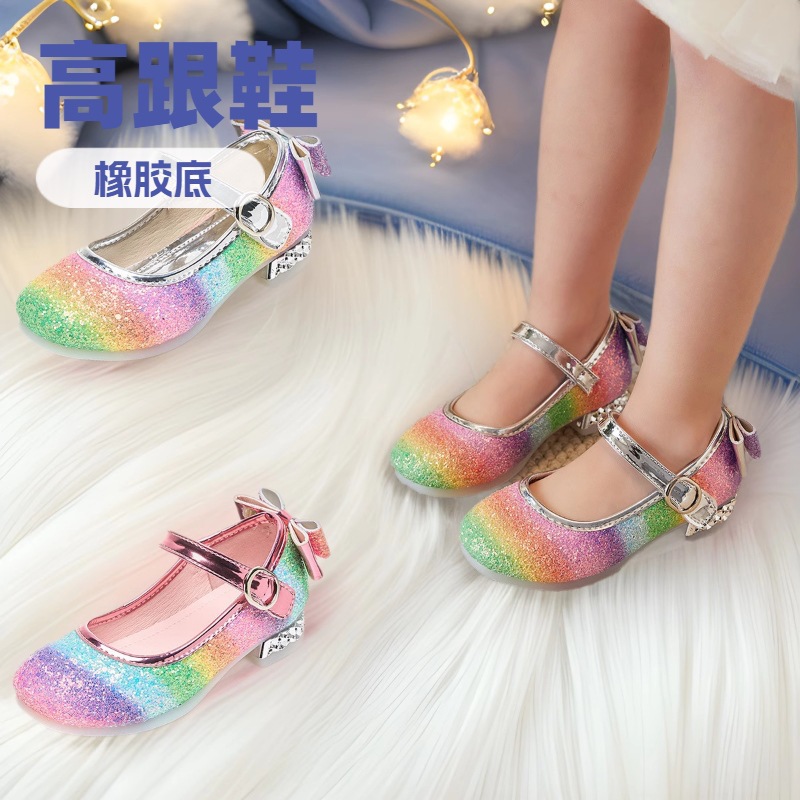 女の子のシングルシューズ、ハイヒールの革靴、エルサの新しいスパンコールピンクのプリンセスシューズ、ダンスパフォーマンスの子供靴、小中型の子供用クリスタルシューズ
