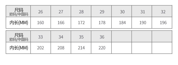尺码 26码内长约22.8CM,27码内长约16.8CM,28码内长约17.4CM,29码内长约18CM,30码内长约18.6CM,31码内长约19.2CM,32码内长约19.8CM,33码内长约20.4CM,34码内长约21CM,35码内长约21.6CM,36码内长约22.2CM,26-30【拍5双】,31-36【拍6双】