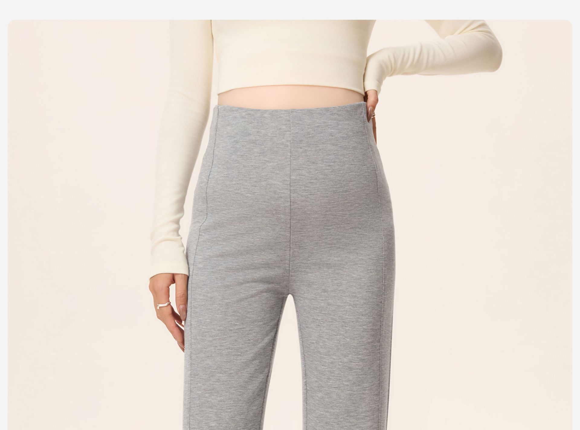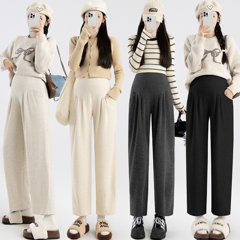 小柄な妊婦さん向けのワイドレッグパンツ、秋冬用、腹部を支えない、紐付き、お腹を締め付けない、妊娠中も外で着られるストレートカジュアルパンツ