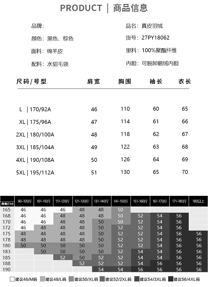 尺码 170/L,175/XL,180/2XL,185/3XL,190/4XL,195/5XL