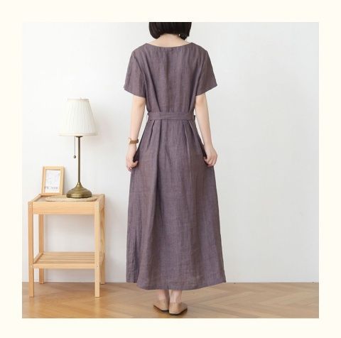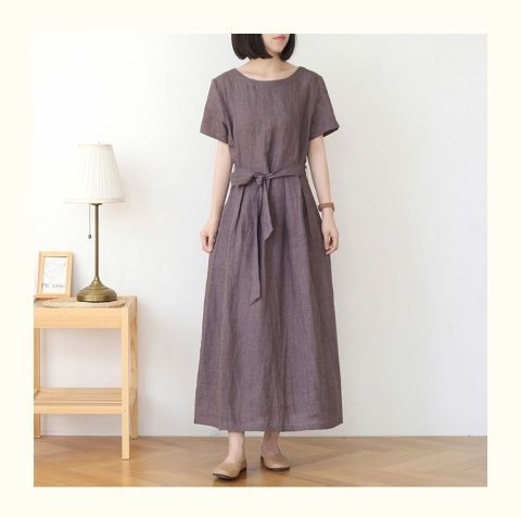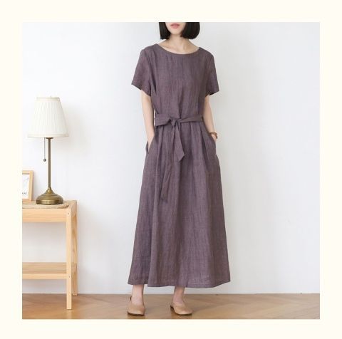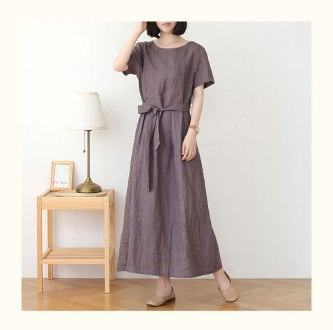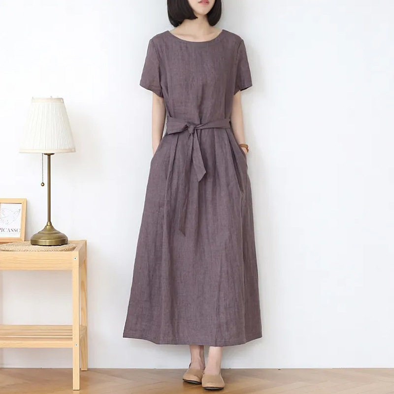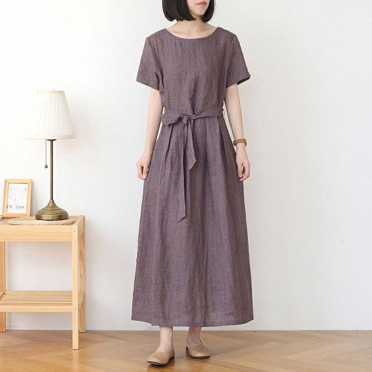 圆领短袖夏季新款棉麻连衣裙新款女复古宽松纯色文艺裙子时尚系带