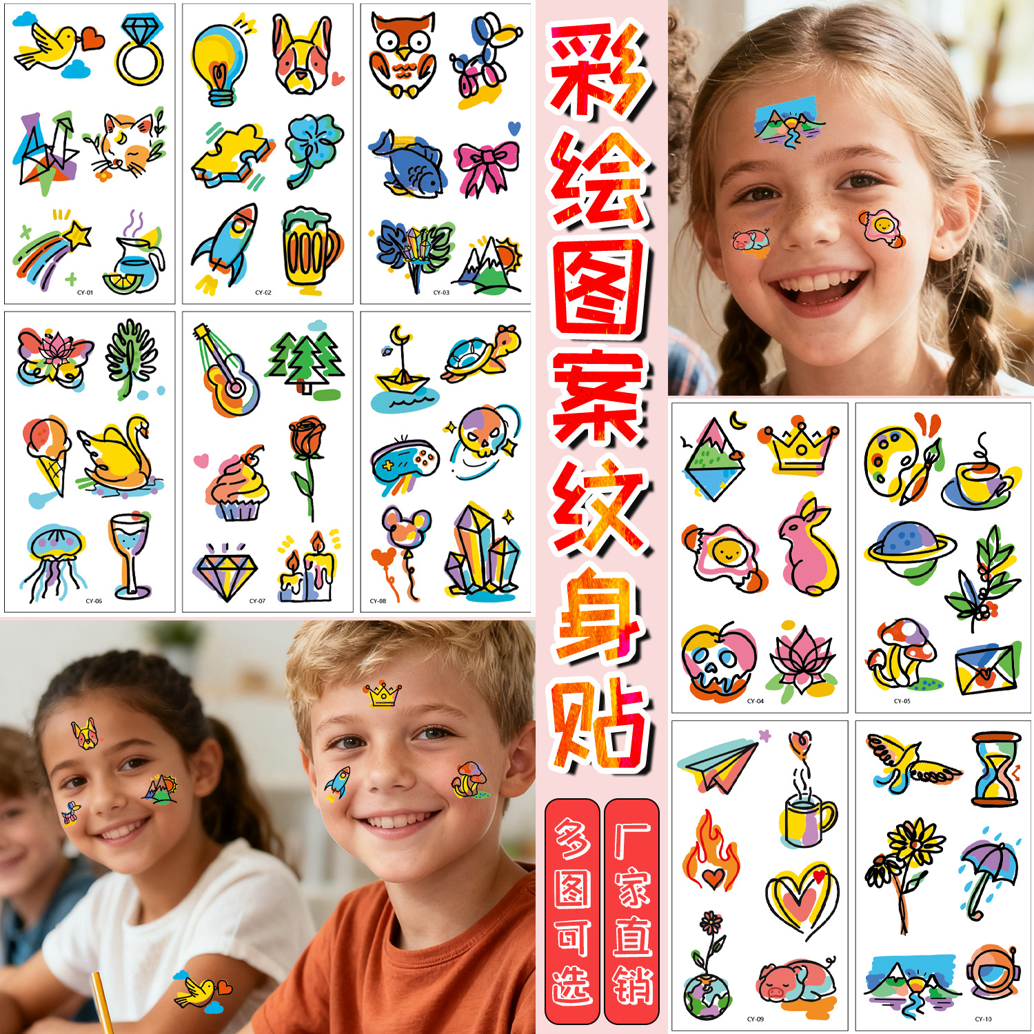 跨境新款彩绘卡通可爱纹身贴水彩动物贴纸彩色高级感跨境纹身贴