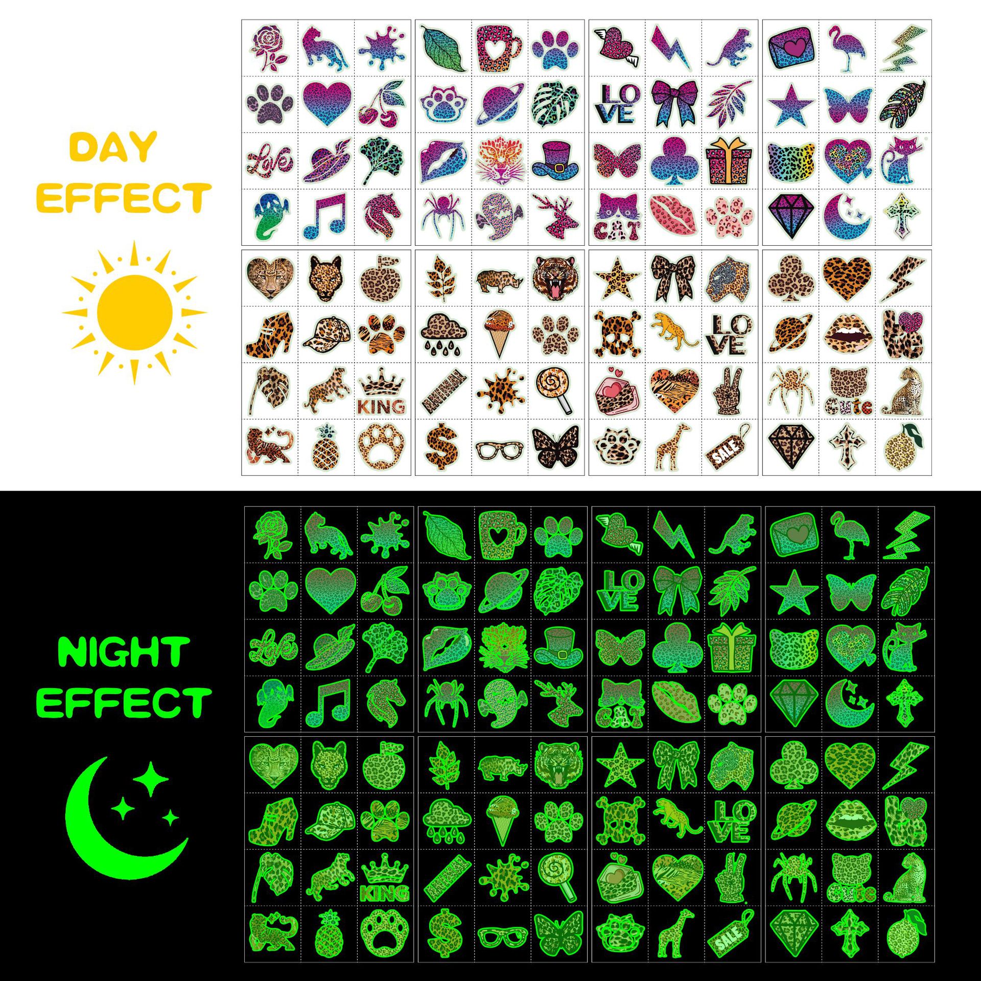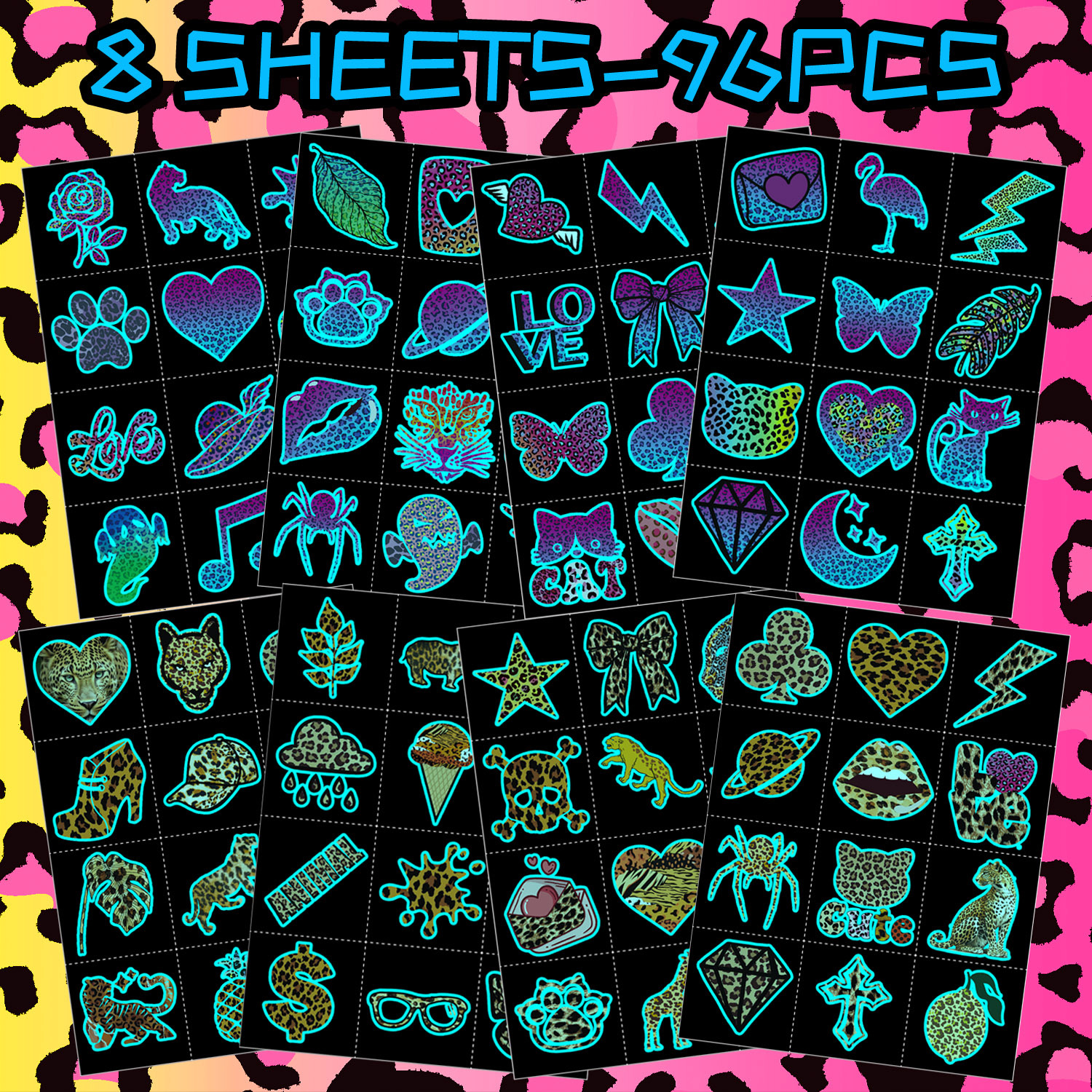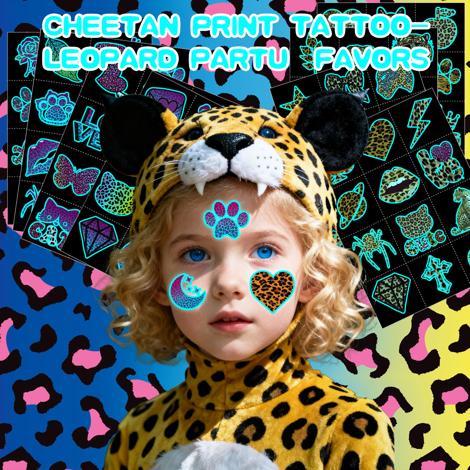亚马逊新款96件绿夜光豹纹身贴生日派对脸贴高级感贴纸卡通装饰品