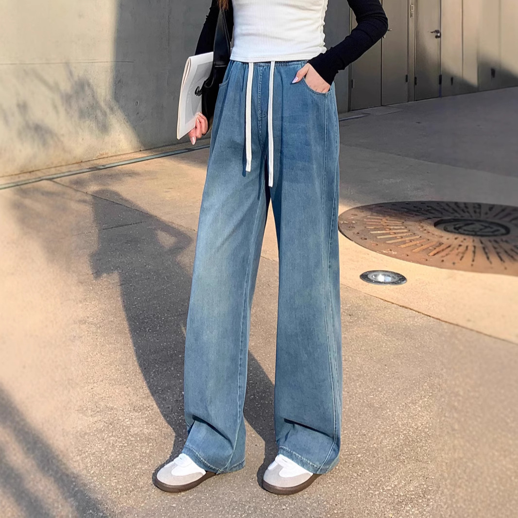 超太綿の9分のズボンの女性2025春秋の新型の高い腰の垂れ下がった感じはやせているストレートなズボンの小さい子供のカジュアルな女性のズボンを現します。