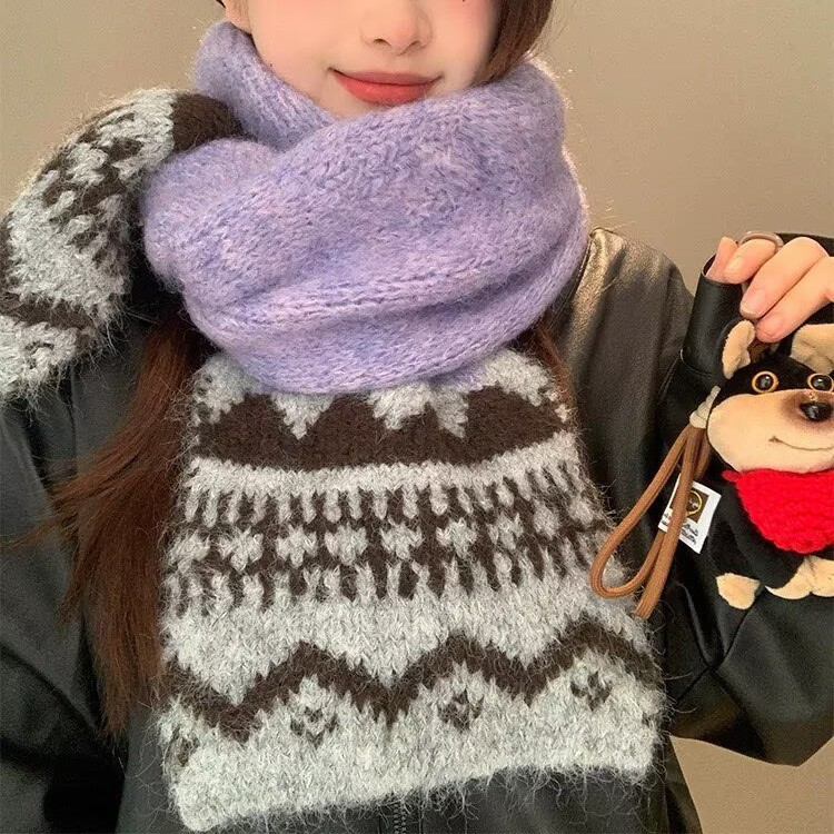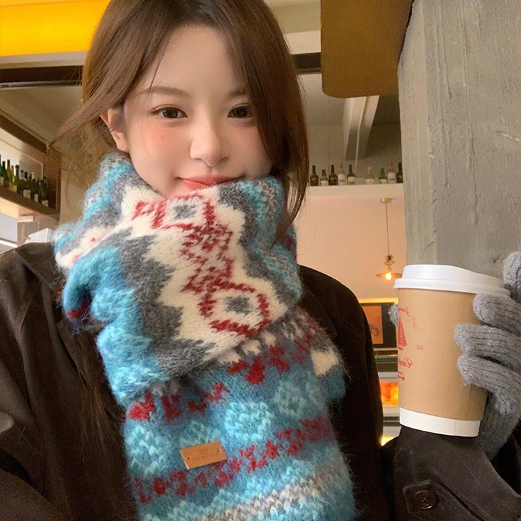 韩系复古费尔岛提花针织含羊毛围巾女高品质冬天保暖百搭学生围脖