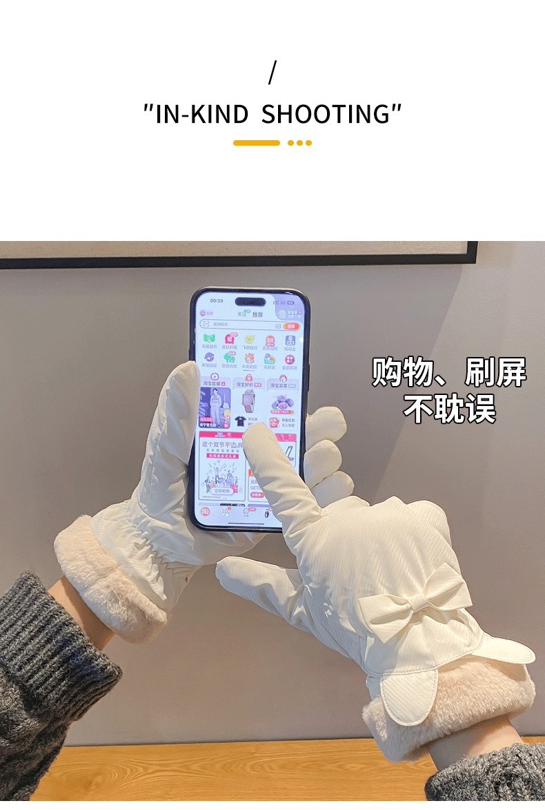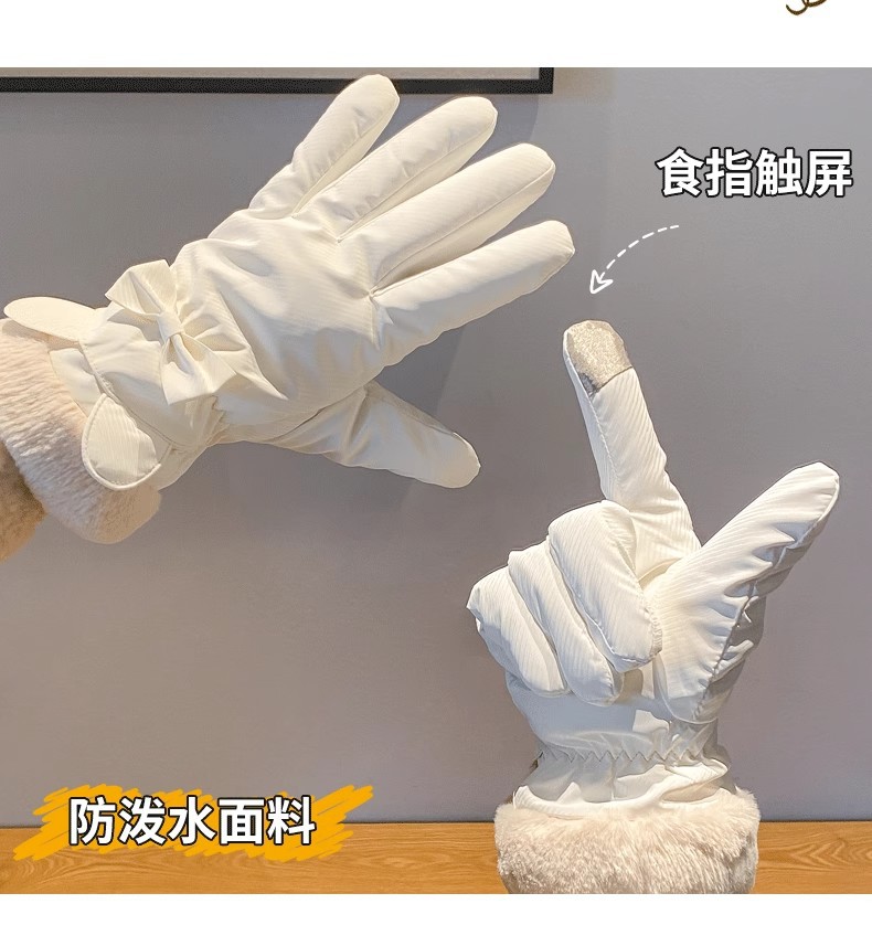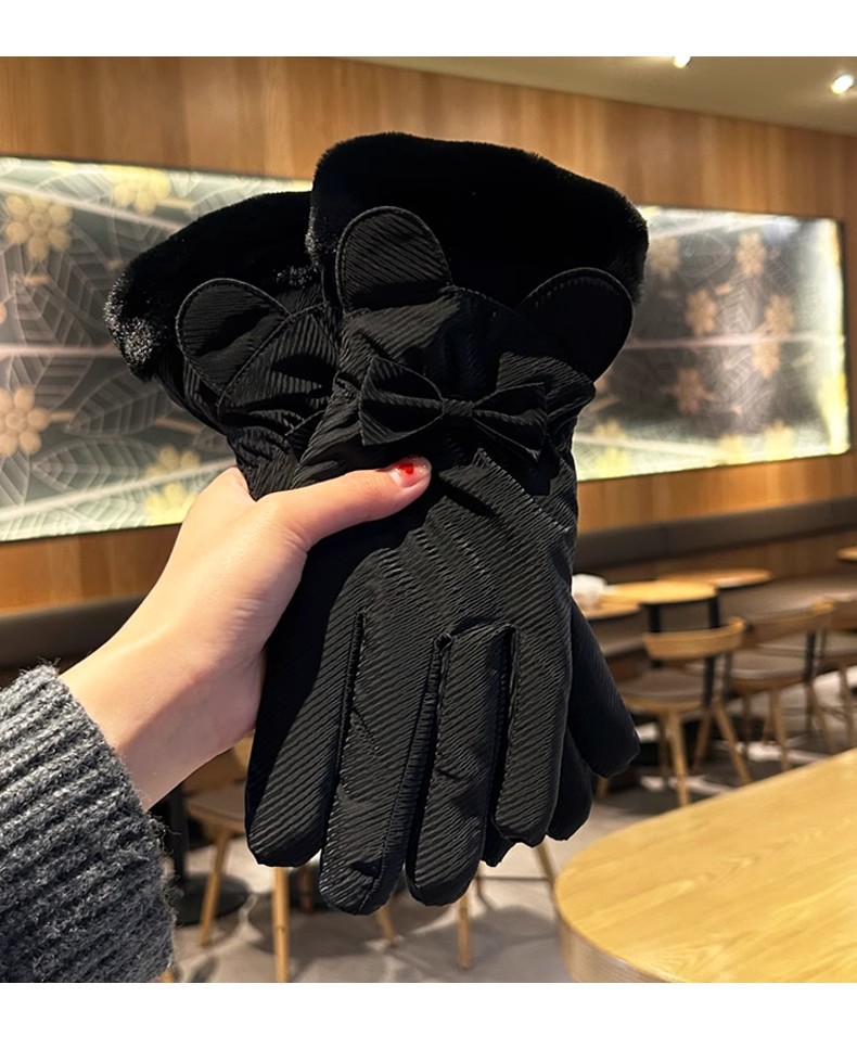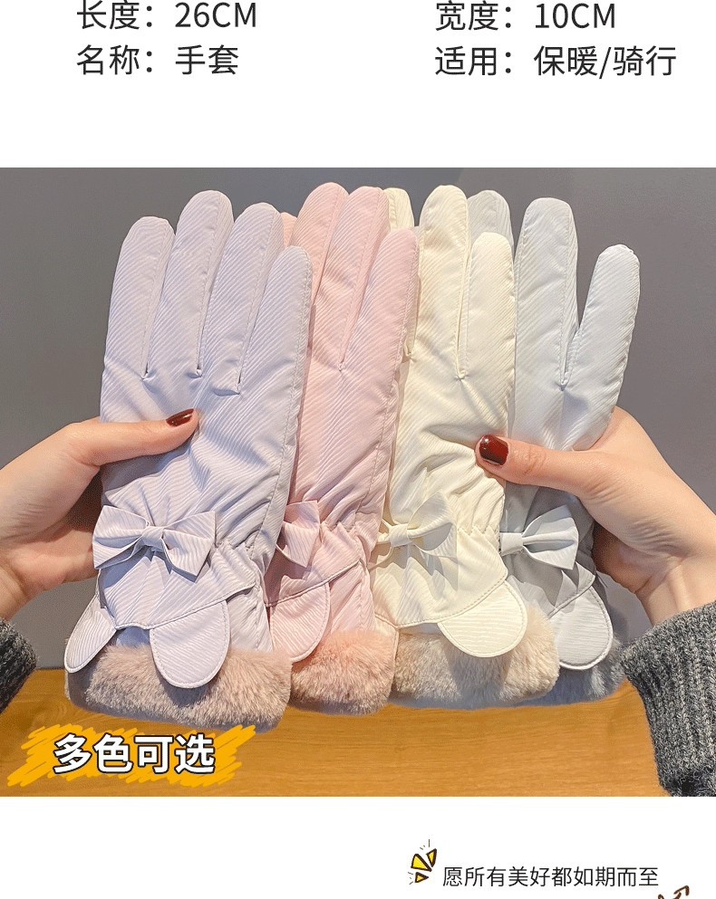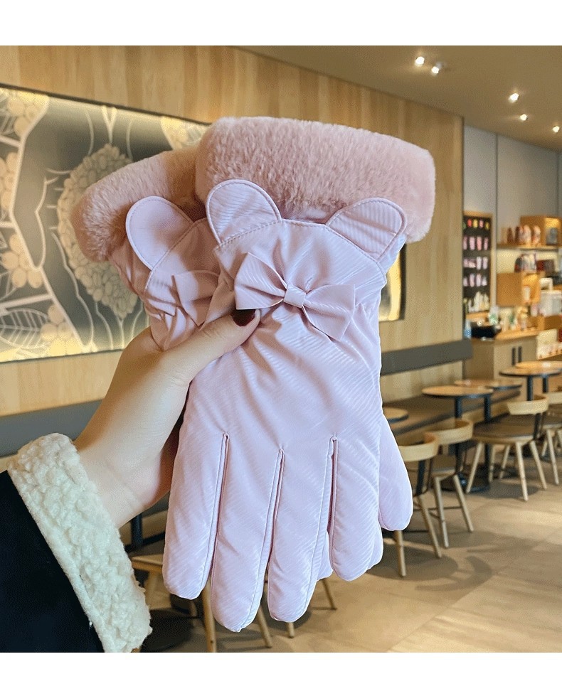 手套女士冬季加绒防寒加厚骑车触屏骑行滑雪可爱蝴蝶结毛绒棉手套