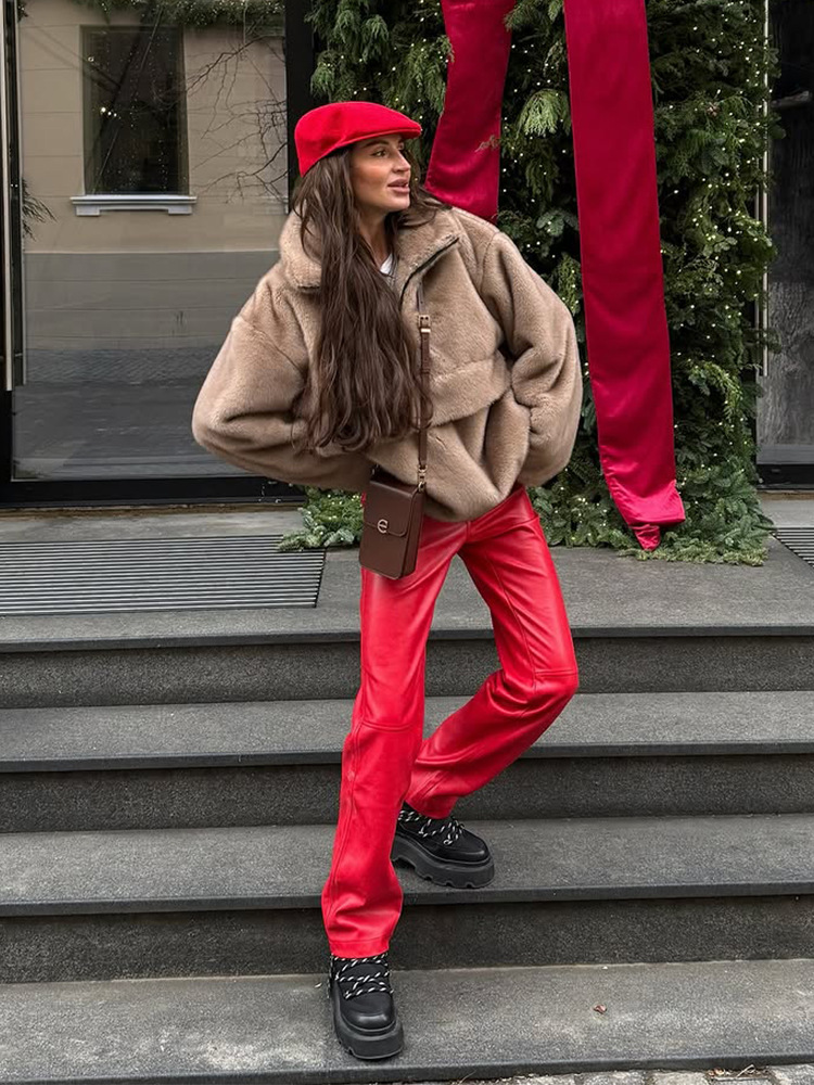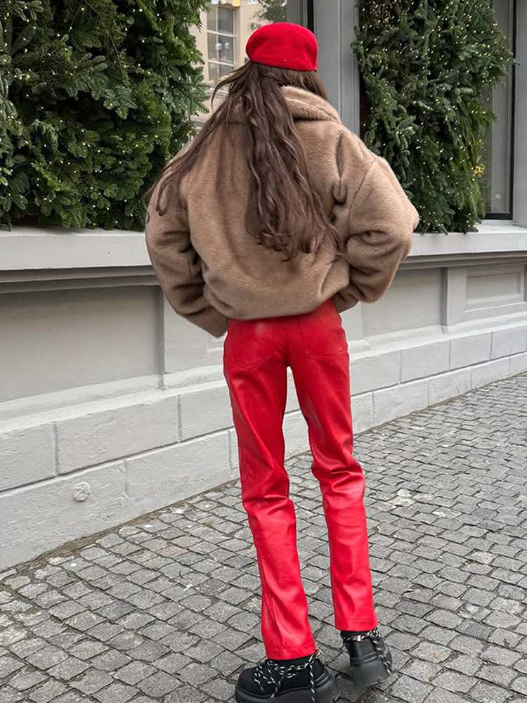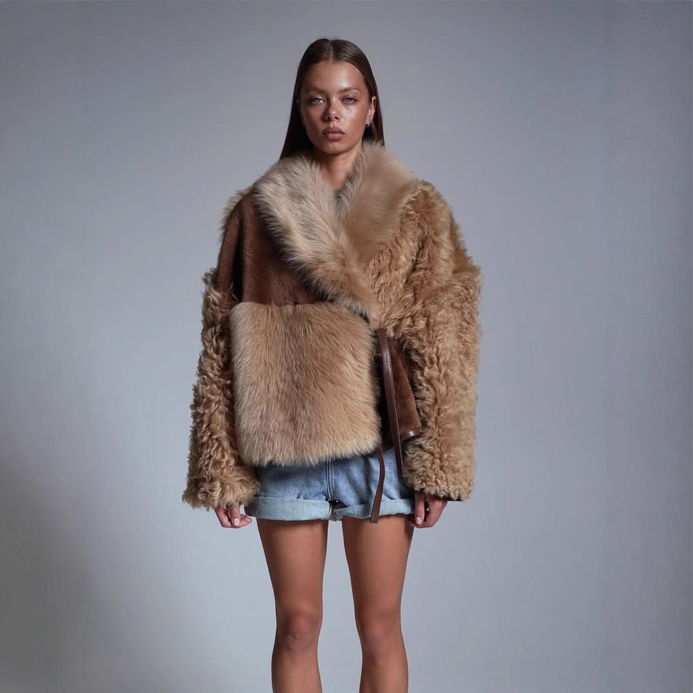 设计感纯色斜襟系带拼接翻领短款皮草外套2025秋冬新款跨境欧美风