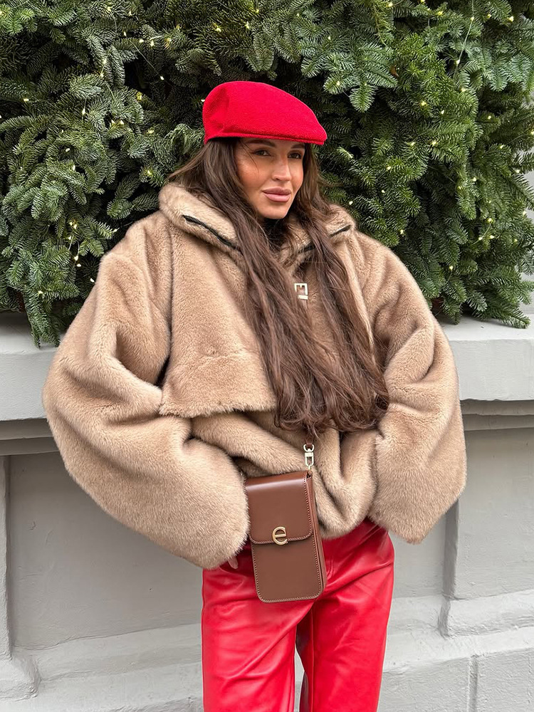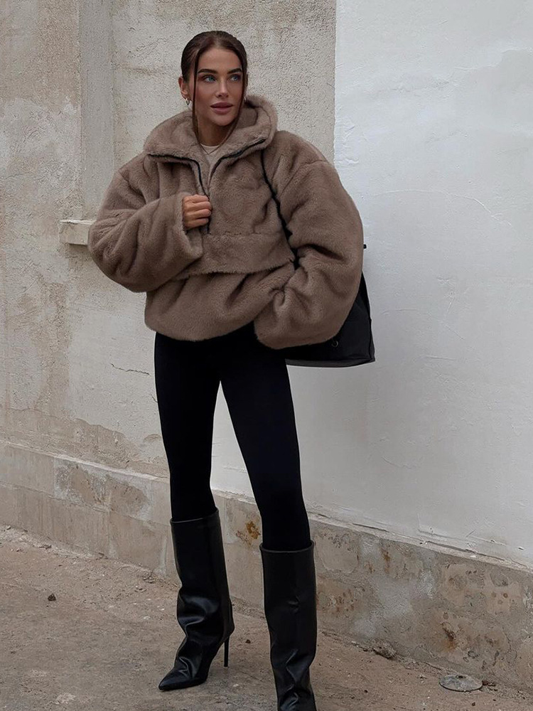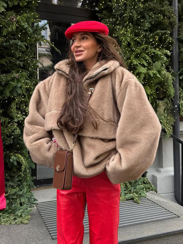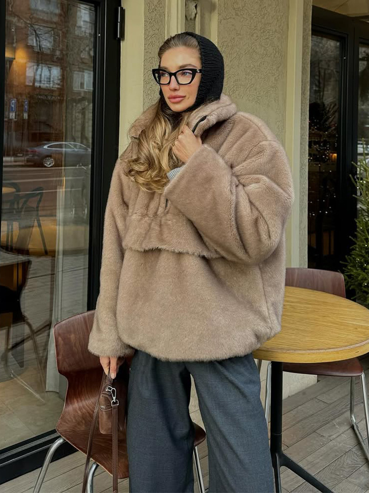 跨境欧美女装2025冬季新款环保皮草外套女宽松仿狐狸毛毛连帽上衣