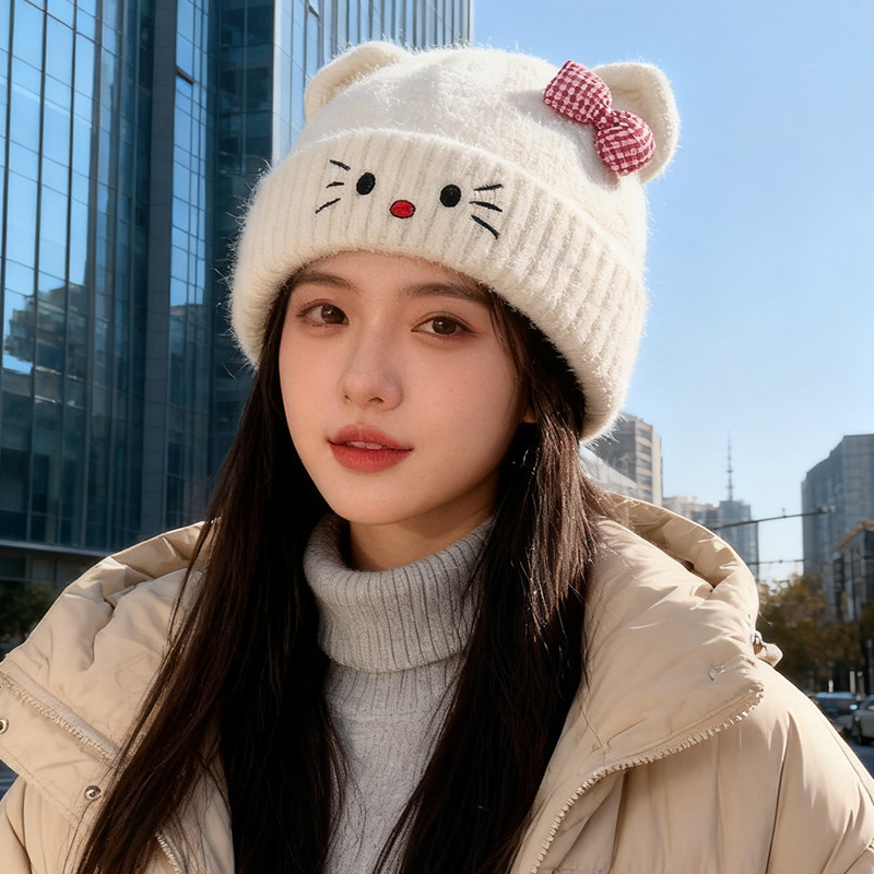 可爱猫耳蝴蝶结毛线帽子女冬季保暖针织帽韩版百搭护耳套头冷帽潮