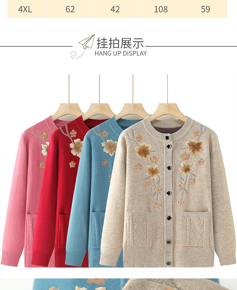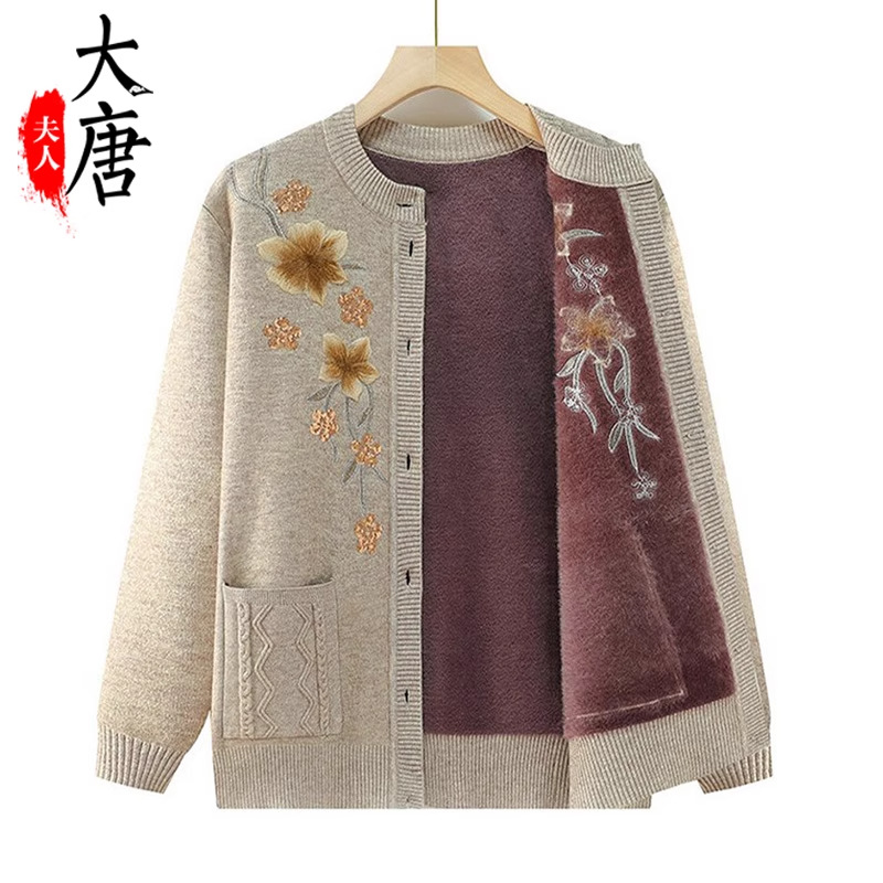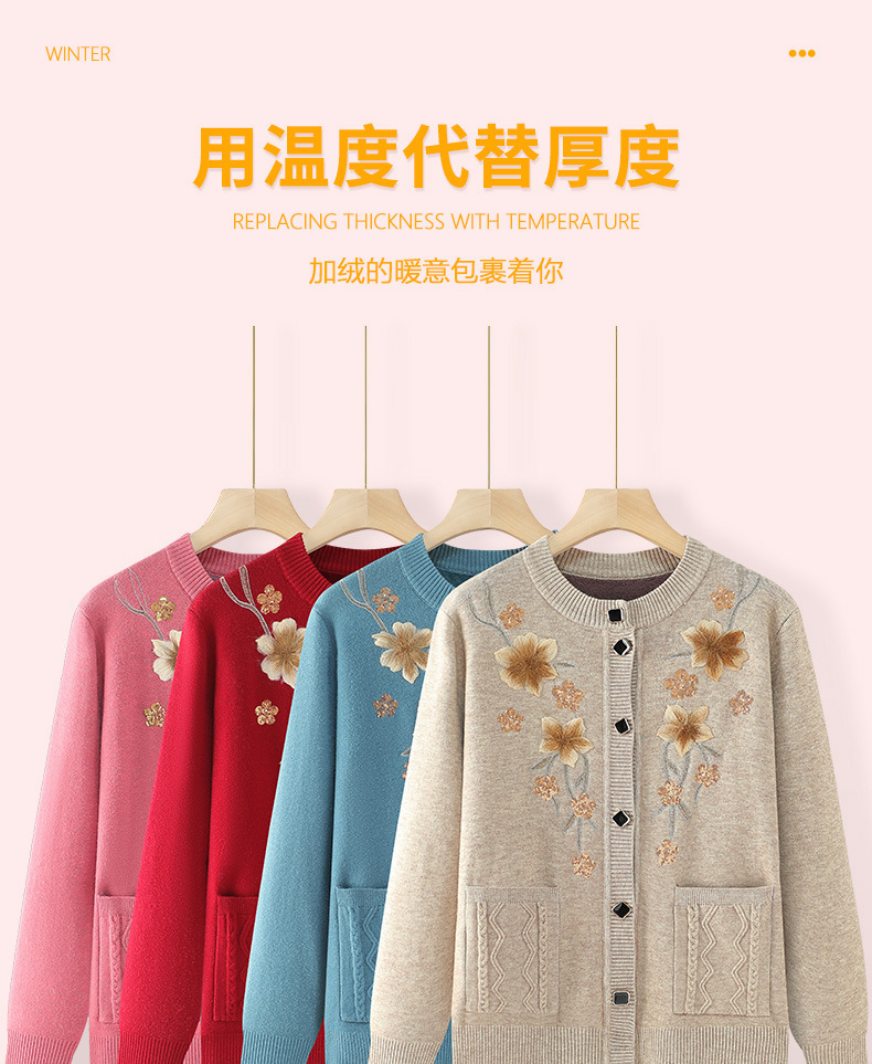 中高年女性向け冬用セーター、お母さん向け秋冬のおしゃれなコート、裏起毛・厚手の暖かい服、おばあちゃん向けニットカーディガン