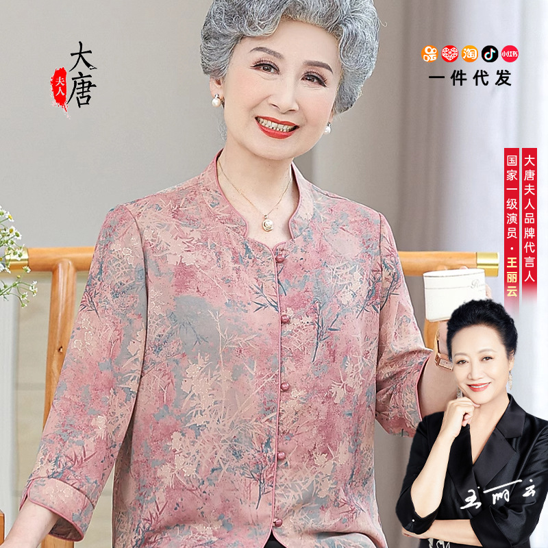 中高年のシャツの女性のおばあさんの夏服のシャツの老人の高級な服の老年のお母さんの春秋の服の喜姑の唐の服