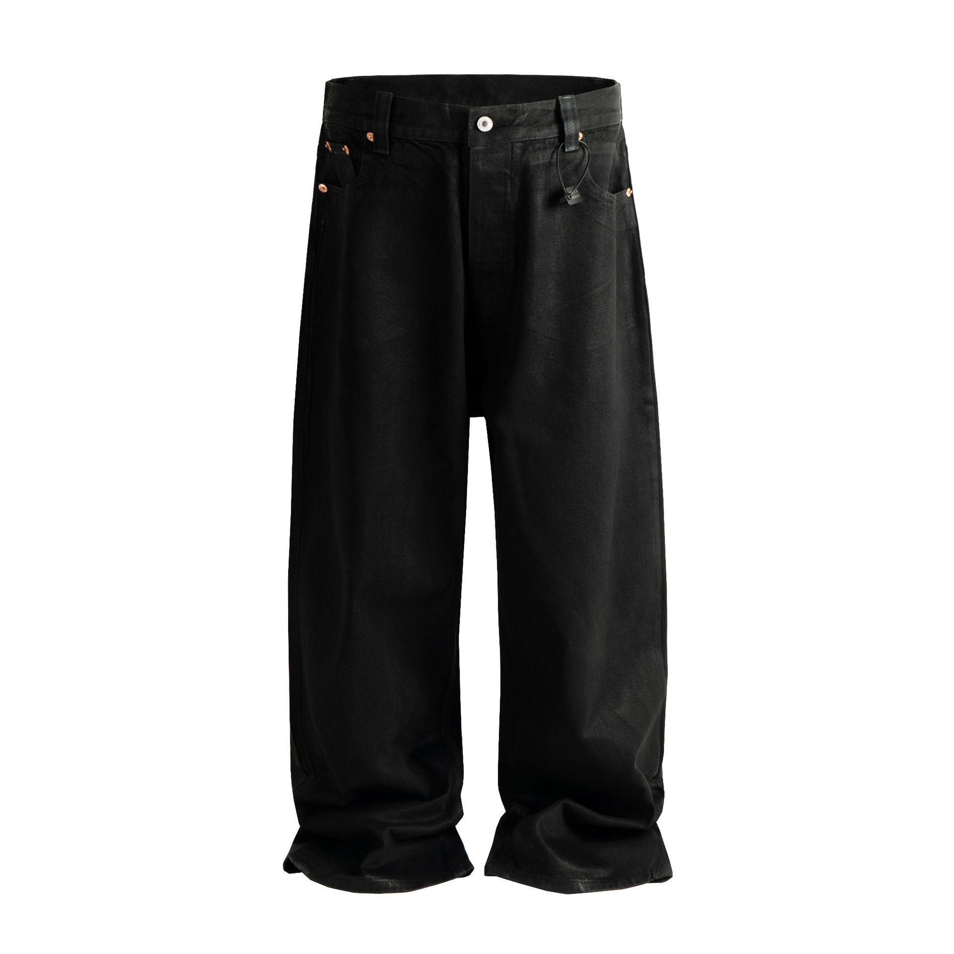 ヘビーデューティーブラックワックスコーティング光沢のあるシルエットのルーズワイドレッグジーンズ
