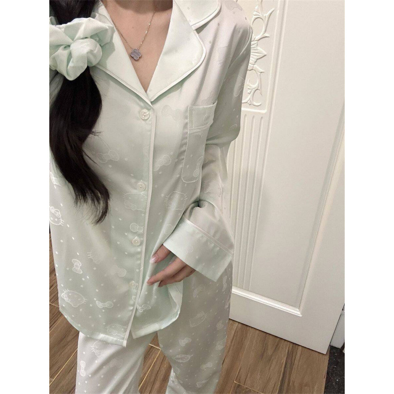 春秋爆款睡衣女夏季提花冰丝卡通开衫长袖长裤家居服套装跨境批发