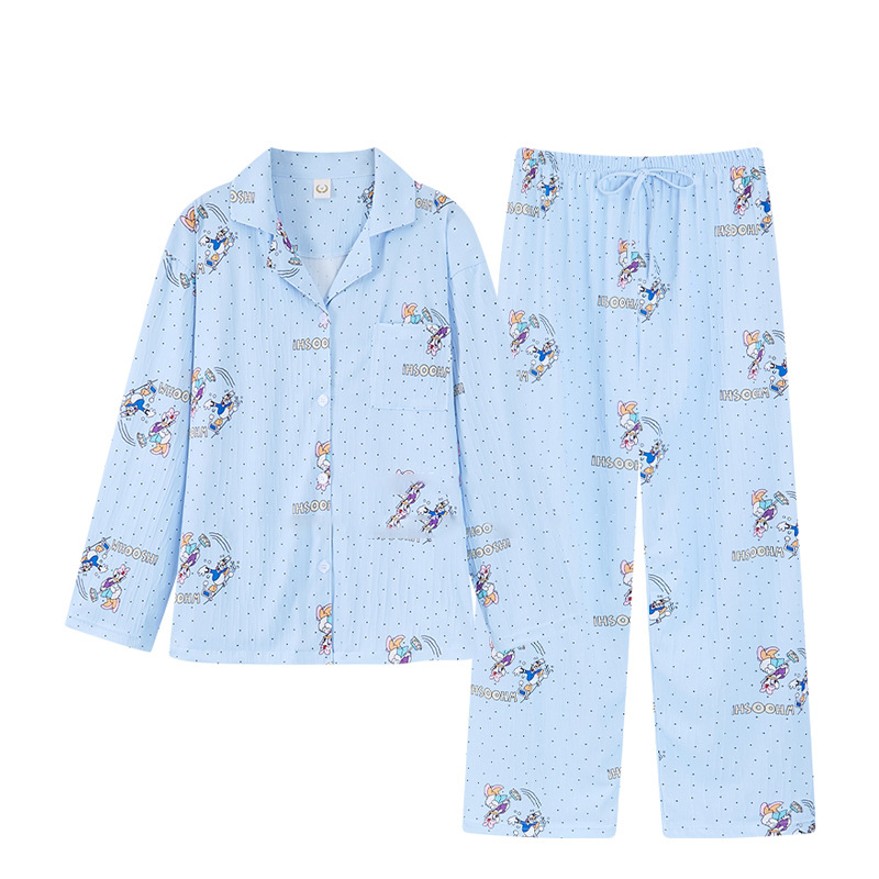 春と秋の女性用クロスボーダー貿易ラペルパジャマ、長袖ズボン、黒い点の漫画の女の子のホーム服、卸売かわいい