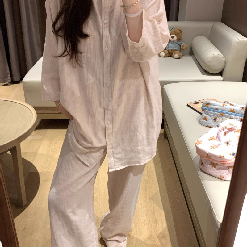 ins韩版睡衣女春秋季长袖套装宽松条纹家居服新款可外穿跨境批发