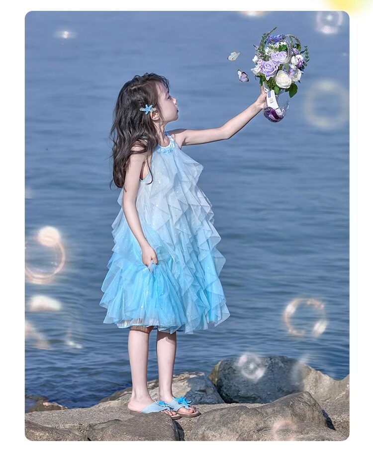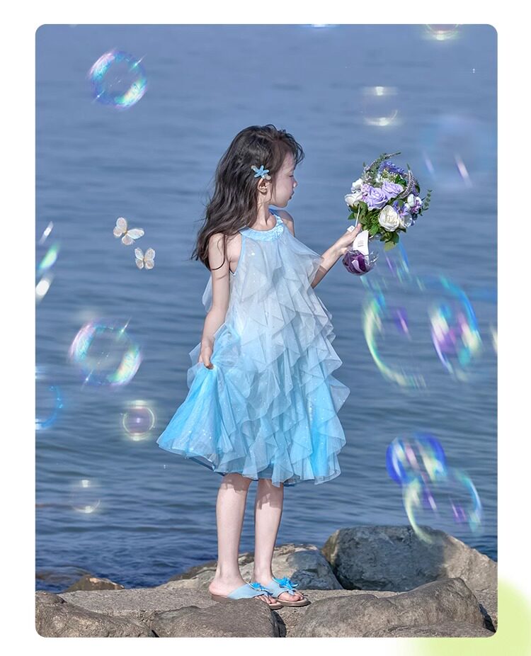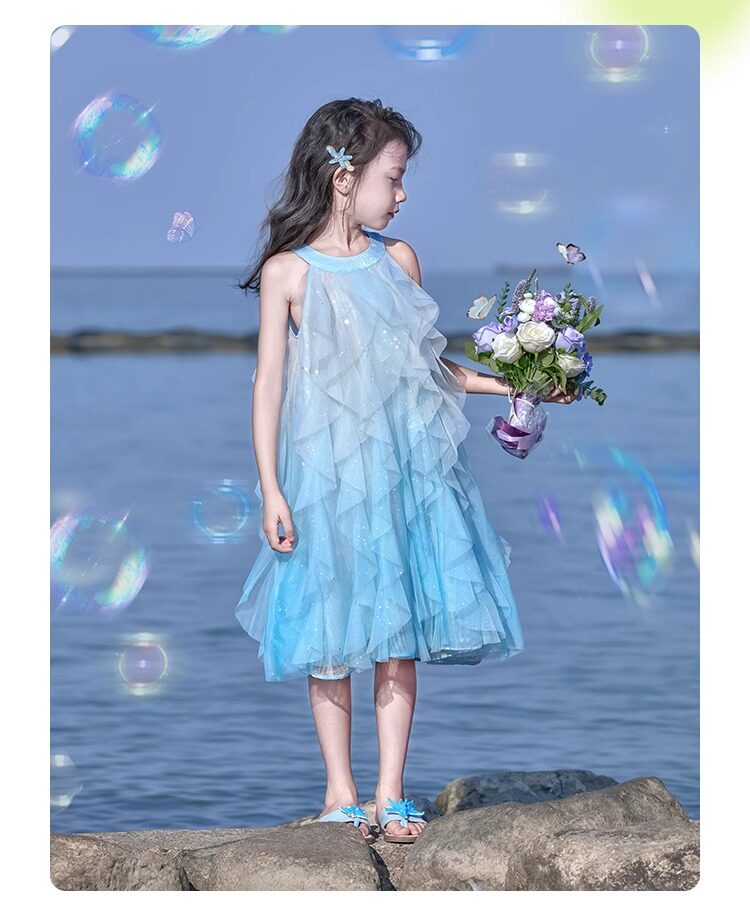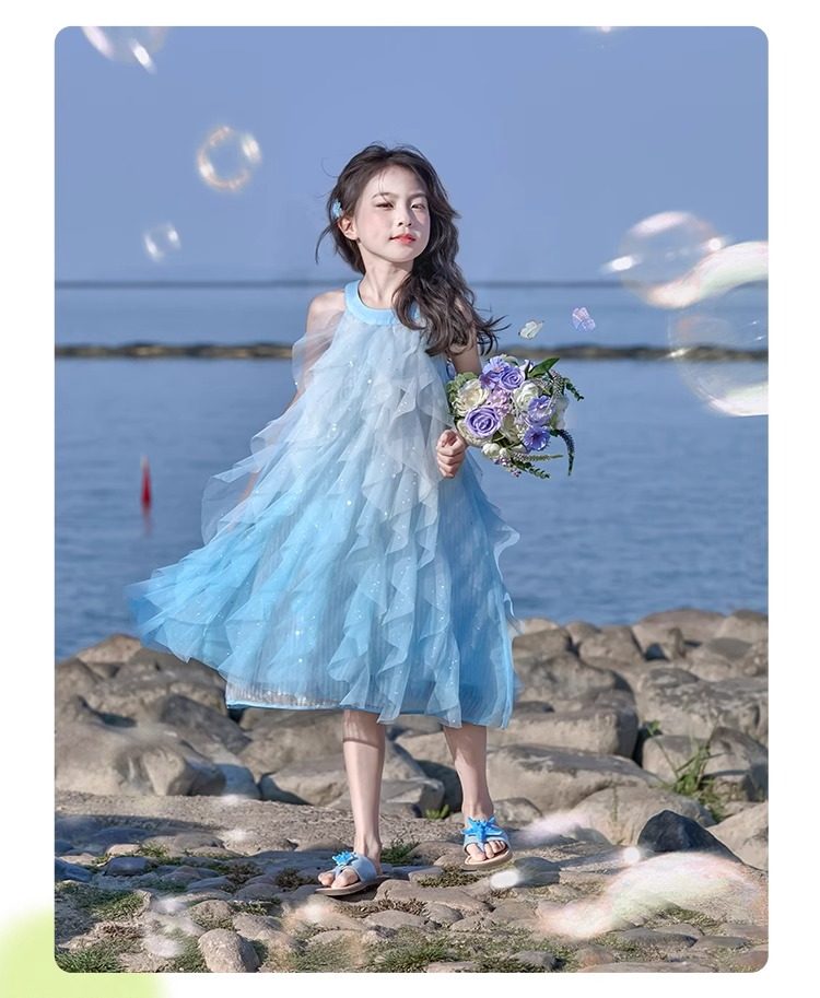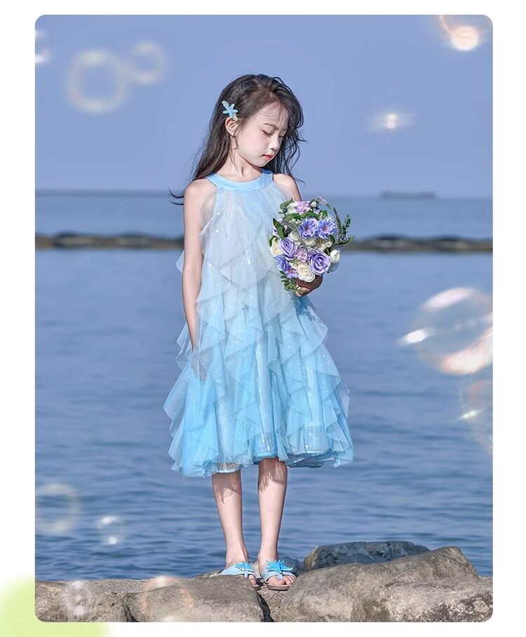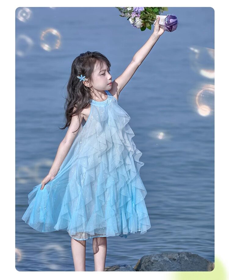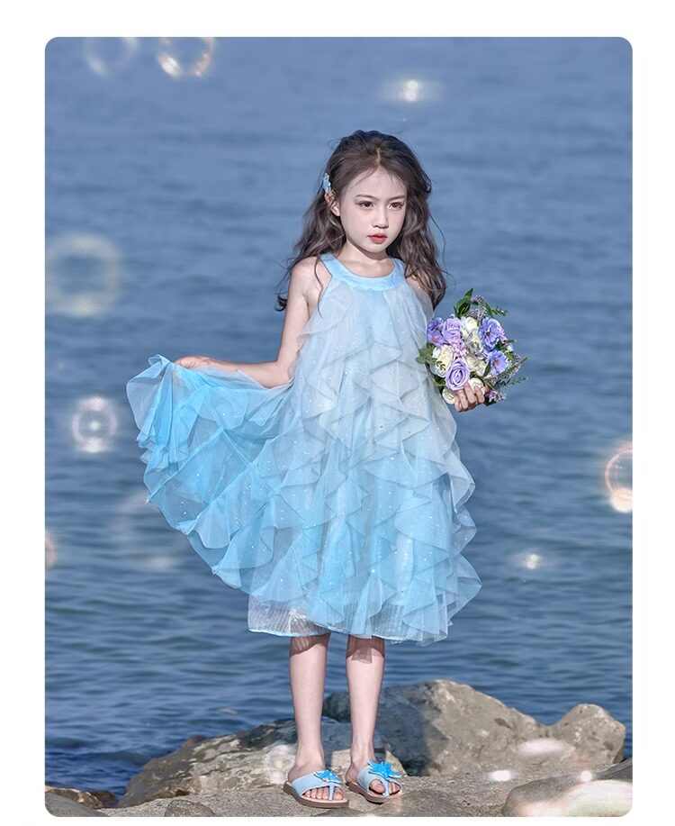 女童挂脖连衣裙5新甜美沙滩裙儿童吊带裙小女孩网纱公主裙夏