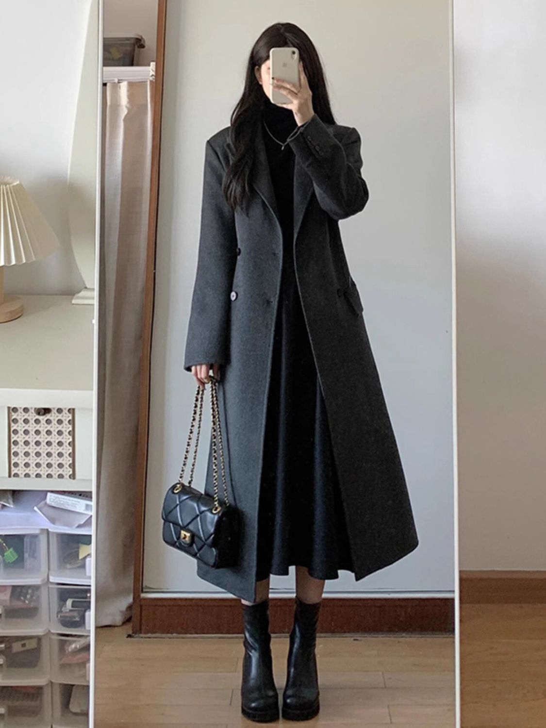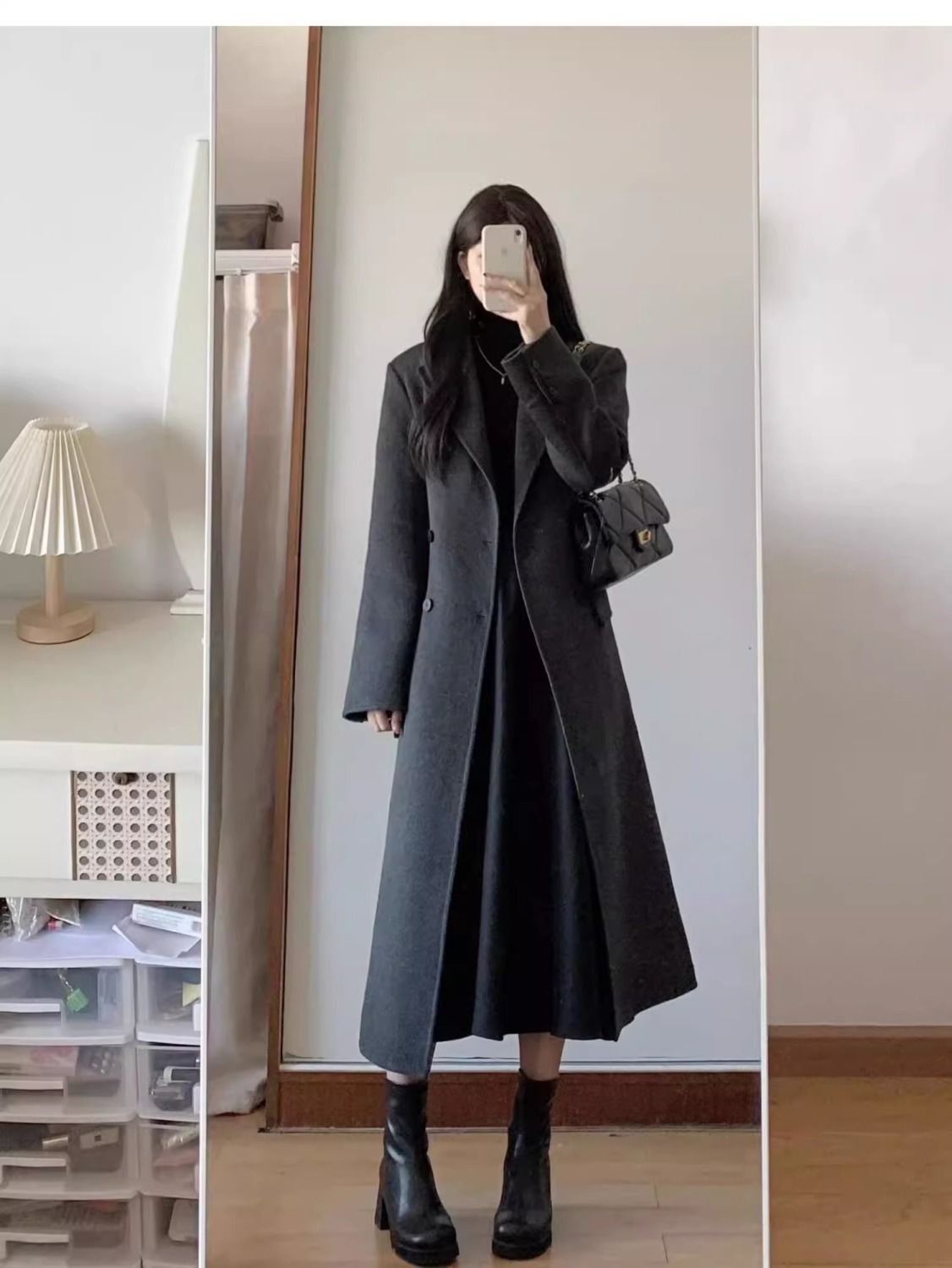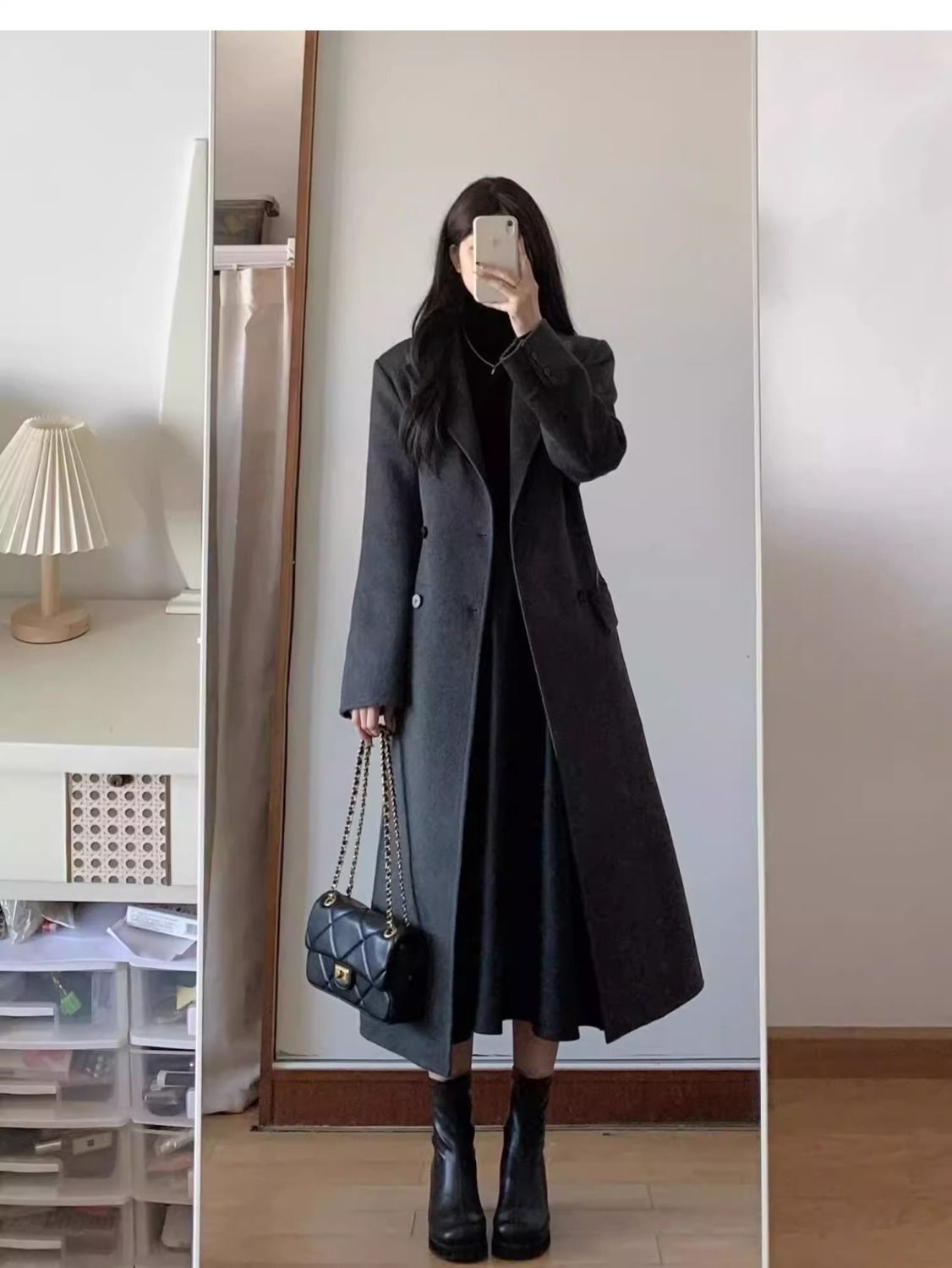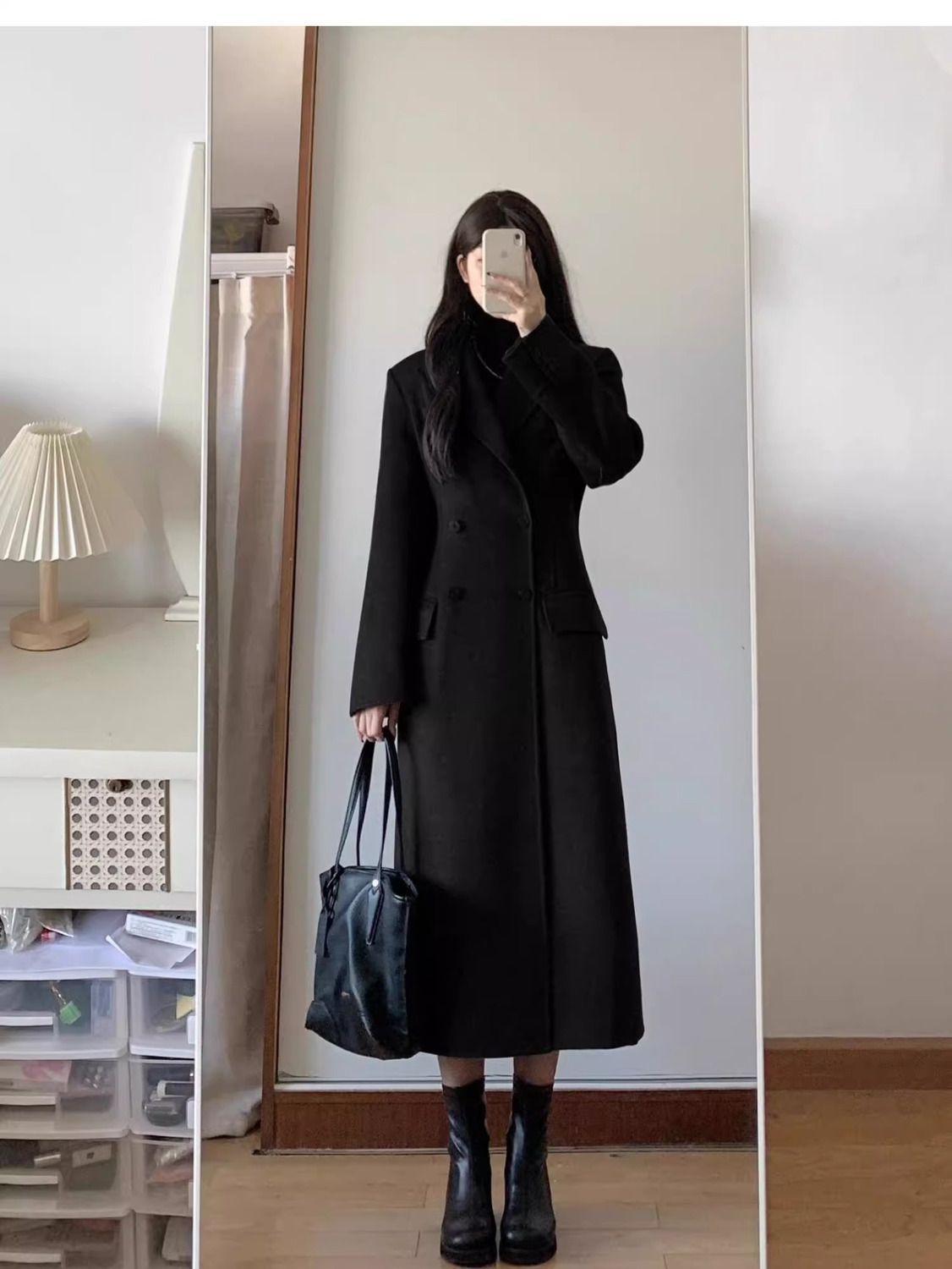 女性のためのシンプルな黒のウールコート 2025 秋と冬の新しいハイエンド韓国ヘボンスタイルウールコートトレンディ