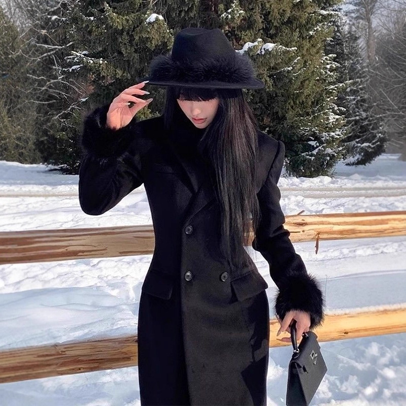 喔歌黑色毛呢外套2025冬季中长款收腰可拆卸毛毛呢子大衣女赫本风