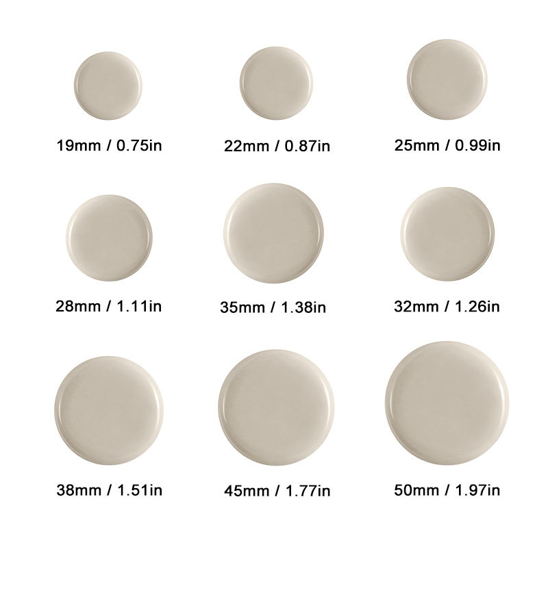 颜色 圆米色(直径19mm),圆米色(直径22mm),圆米色(直径25mm),圆米色(直径28mm),圆米色(直径32mm),圆米色(直径35mm),圆米色(直径38mm),圆米色(直径45mm),圆米色(直径50mm)