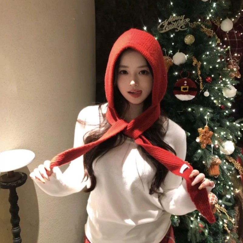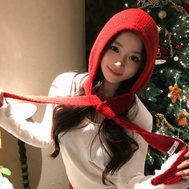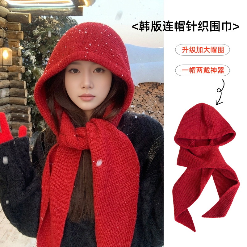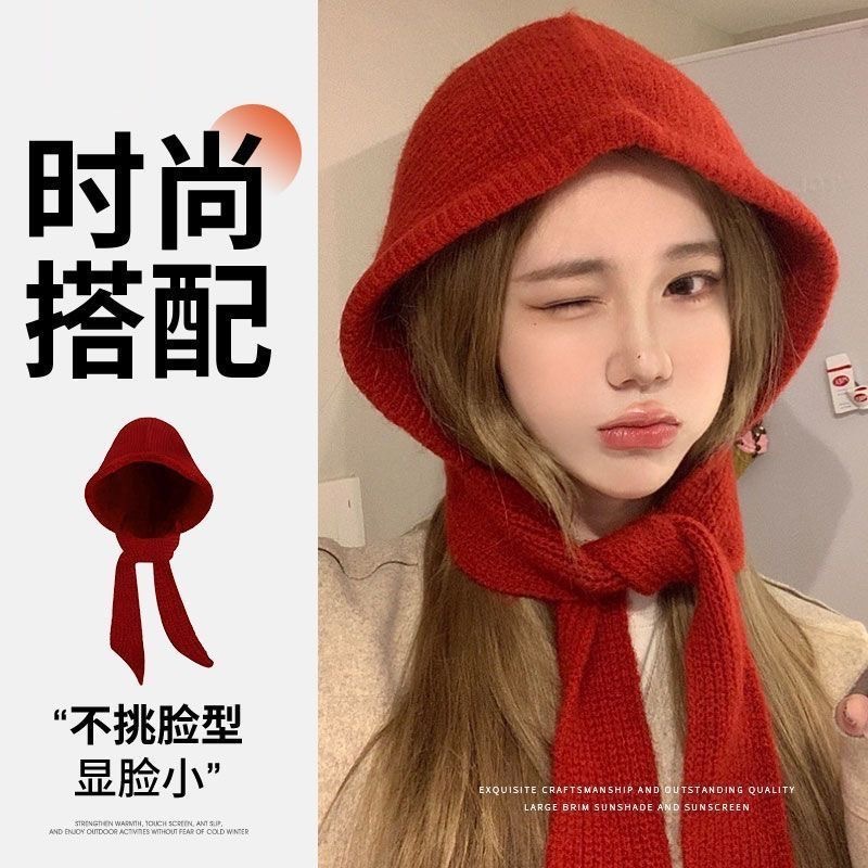 升级红色巴拉克拉法帽女连帽围脖秋冬季披肩针织毛线帽子围巾一体