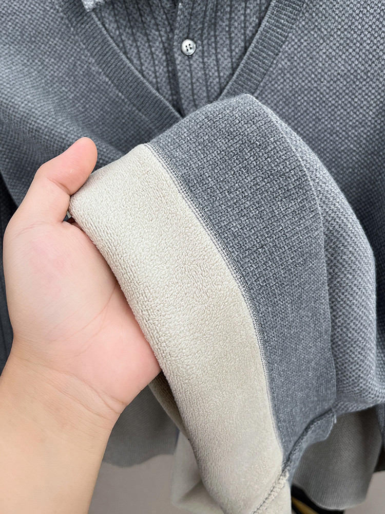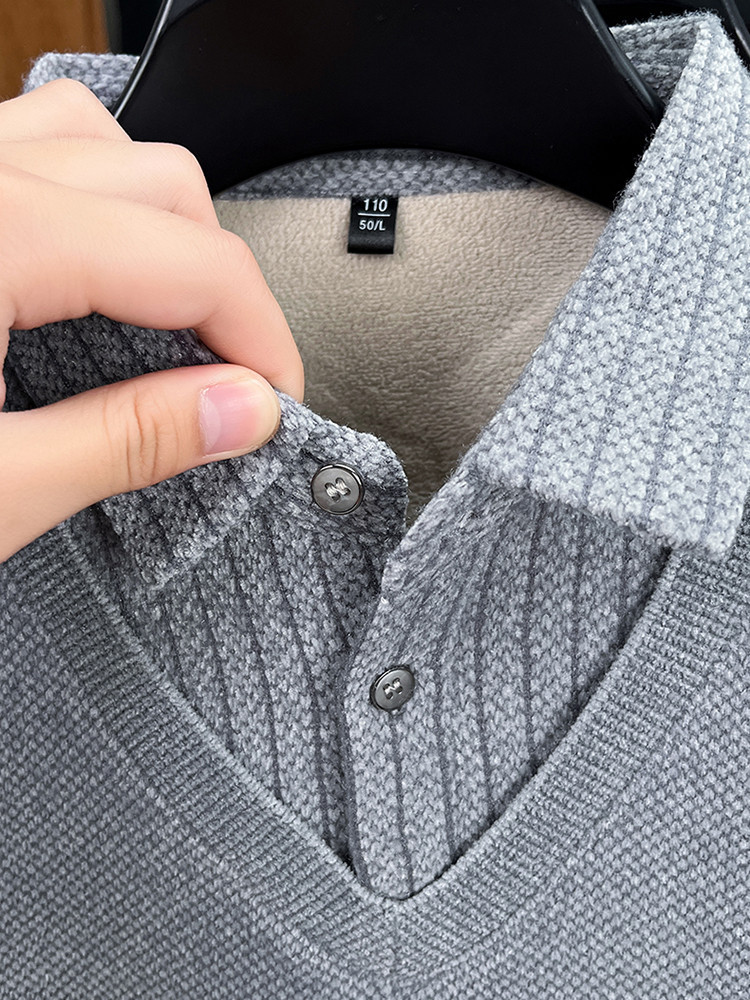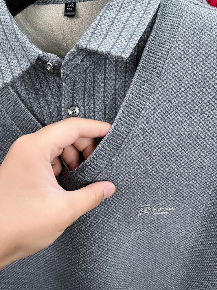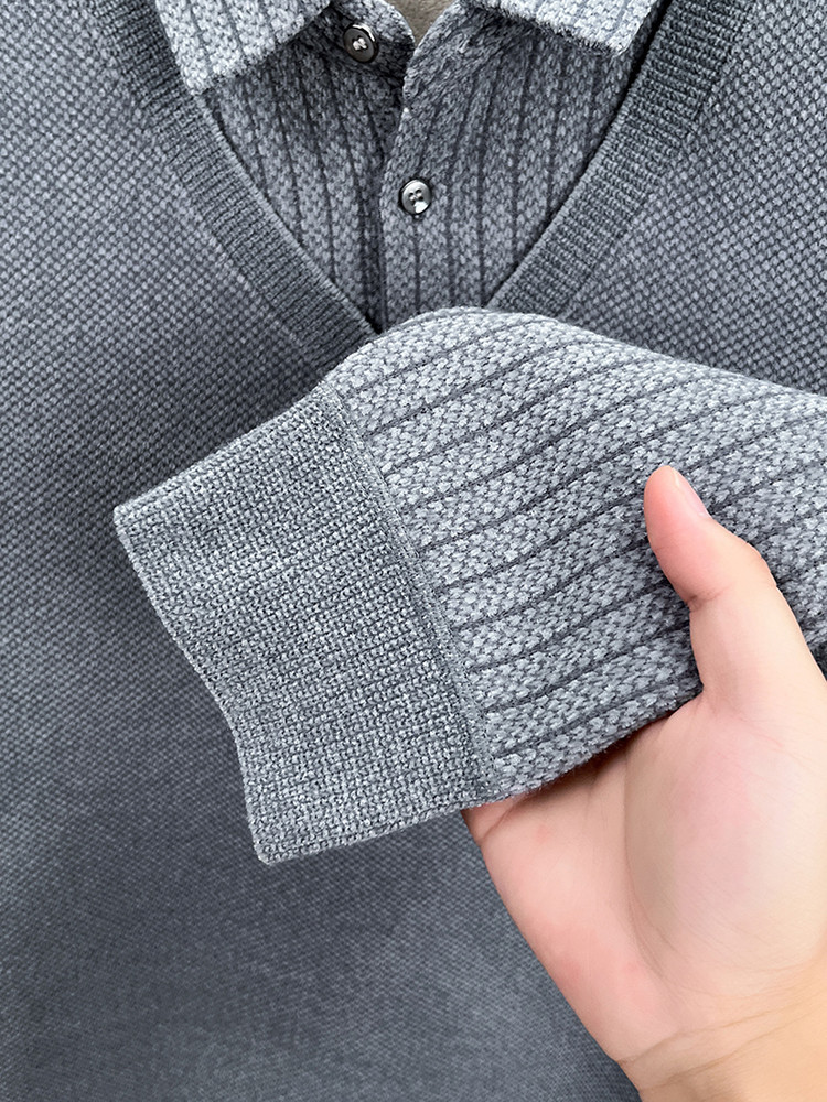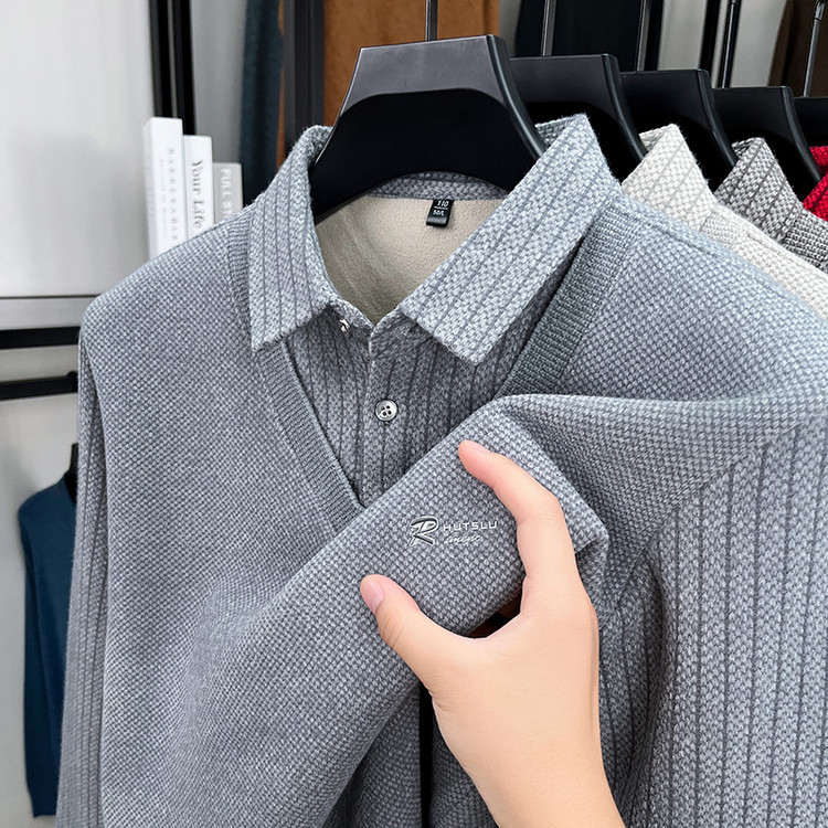 假两件条纹翻领T恤男士冬季加绒加厚中年爸爸装休闲保暖毛衣男装