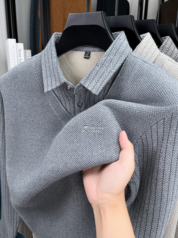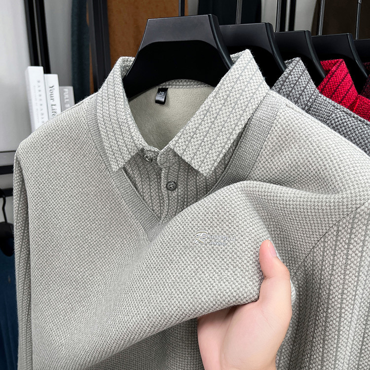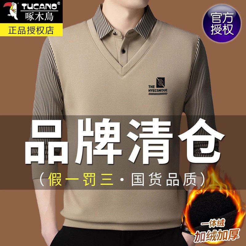啄木鸟秋冬假两件高档长袖T恤上衣男翻领卫衣中年加绒宽松打底衫