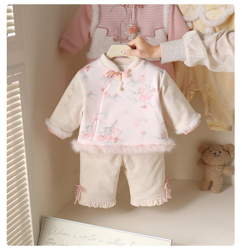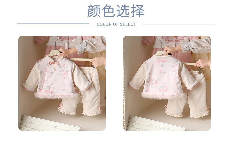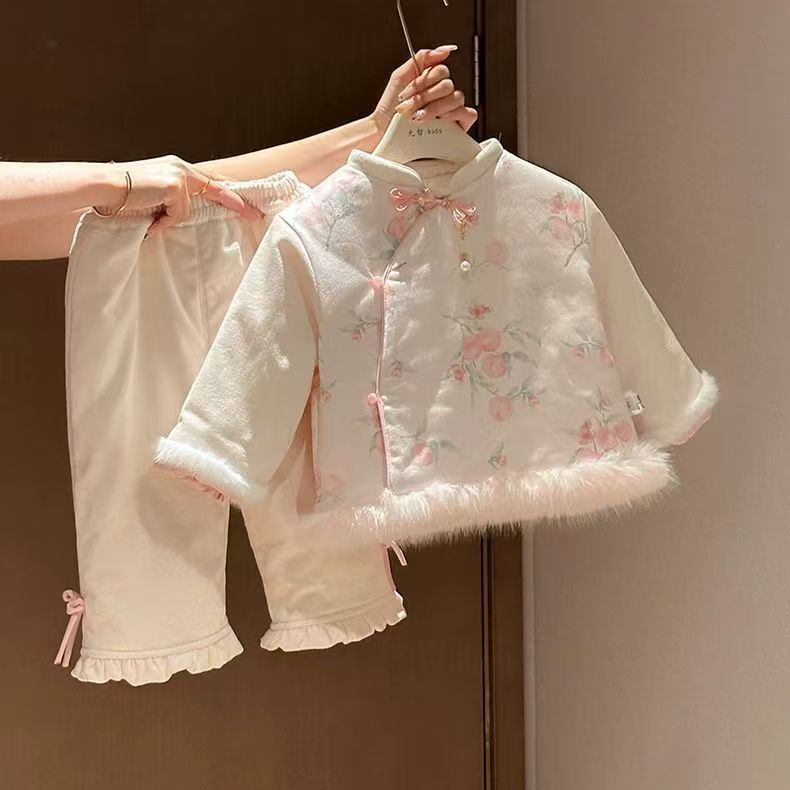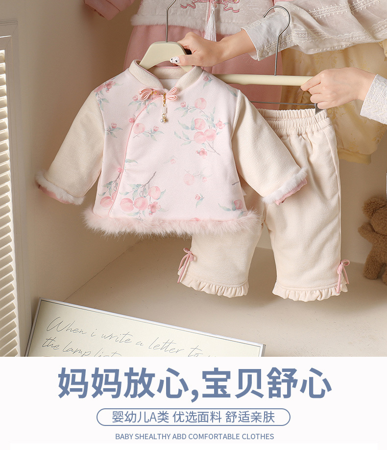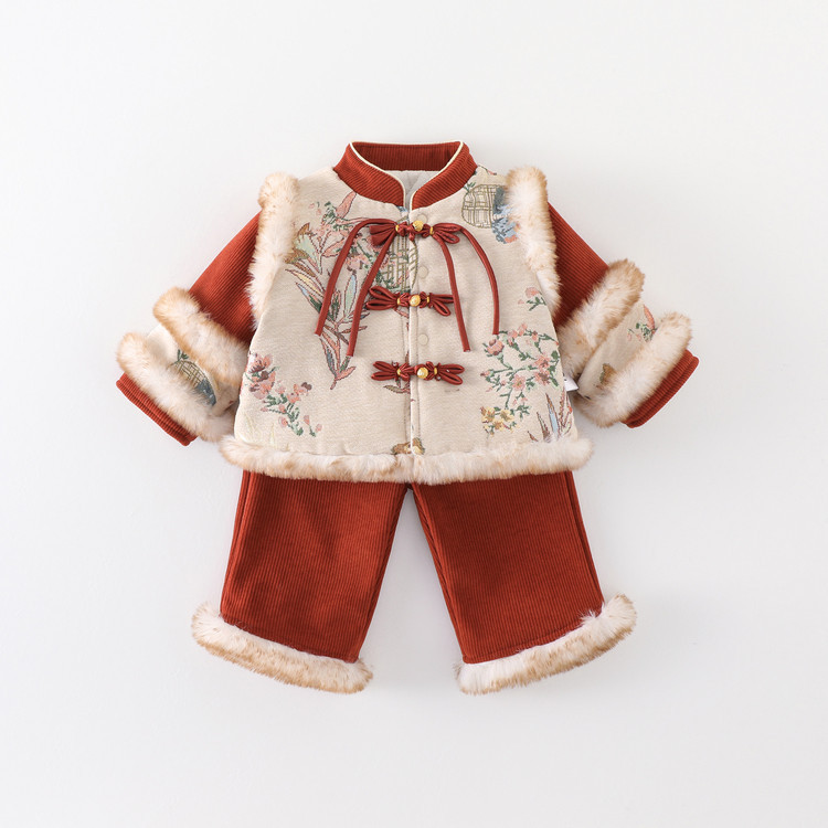 冬装女宝宝加绒夹棉保暖两件套女童中式唐装国风抓周岁宴套装礼服