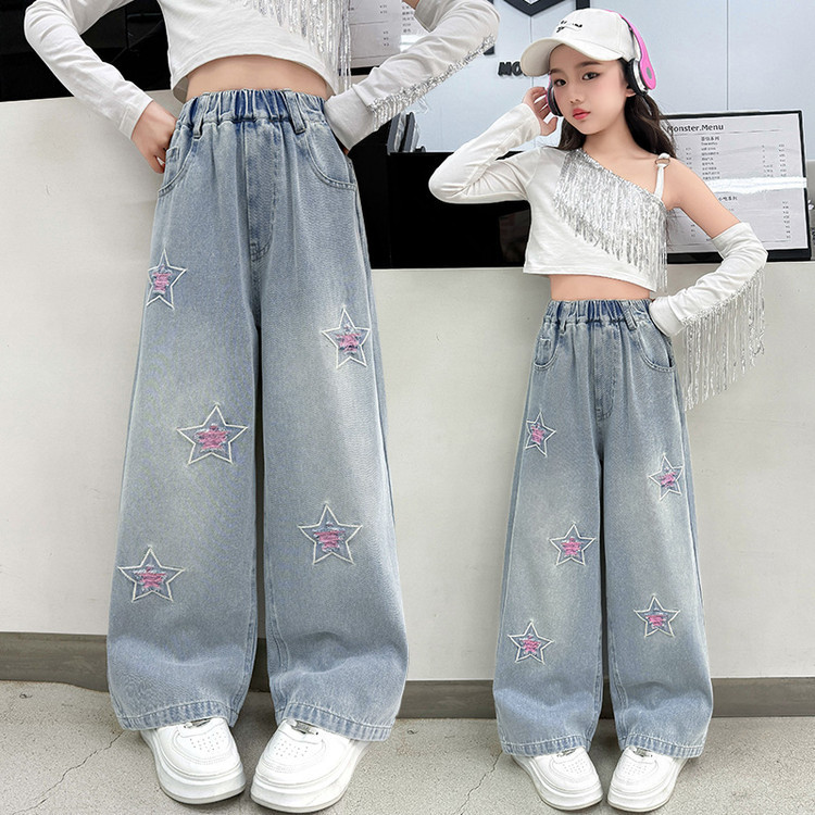 女の子の五角星のジーパン2025春の服装の新型の子供の韓国版の洋気のストレートのズボンの春秋のズボンの中で大きい子供