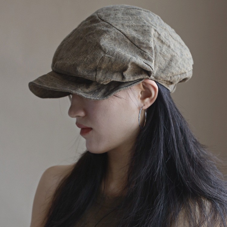 100亚麻材质出口单大头围复古褶皱日系贝雷帽女2025春新款百搭报