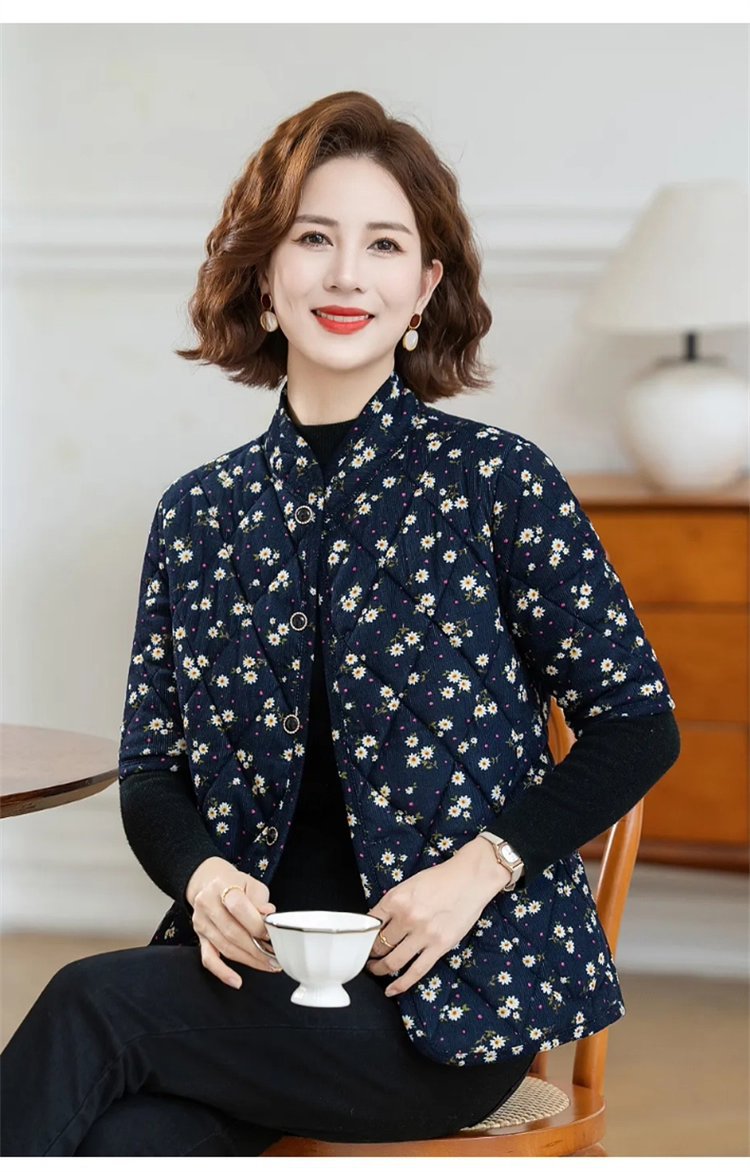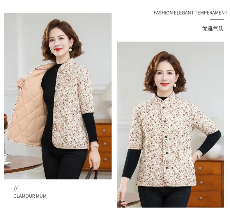 妈妈秋冬装碎花棉马甲外套七分袖棉衣中老年女装加绒翻领保暖坎肩