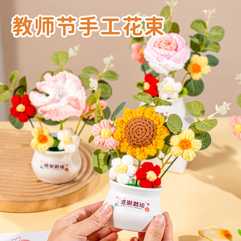 教師の日のギフト、子供たちが先生に贈るギフト、ひまわり模造の永遠の花、手編み完成品の花束、鉢植え