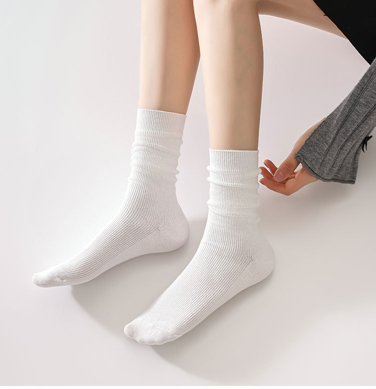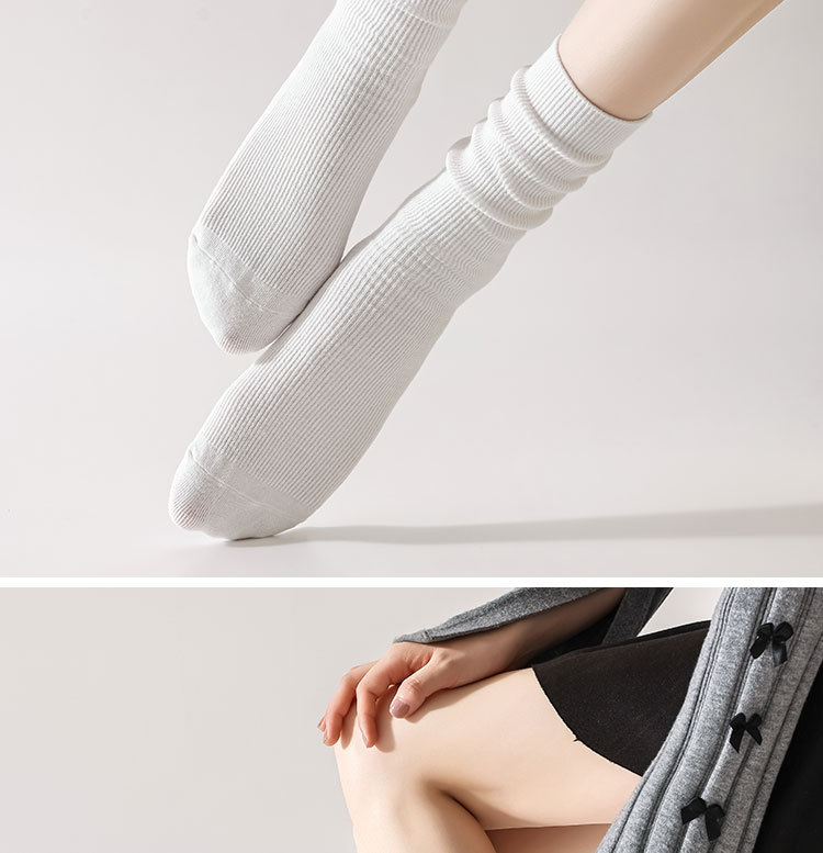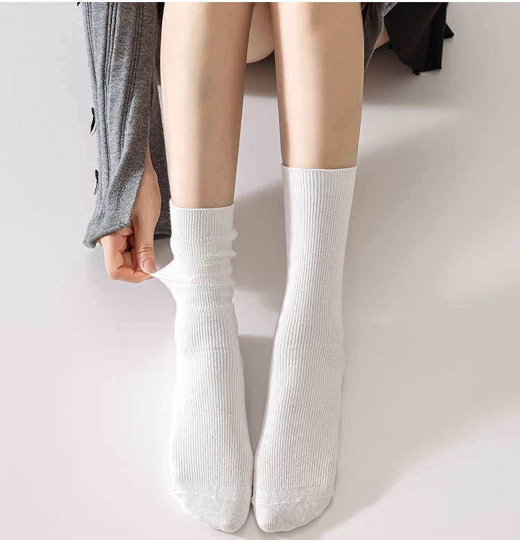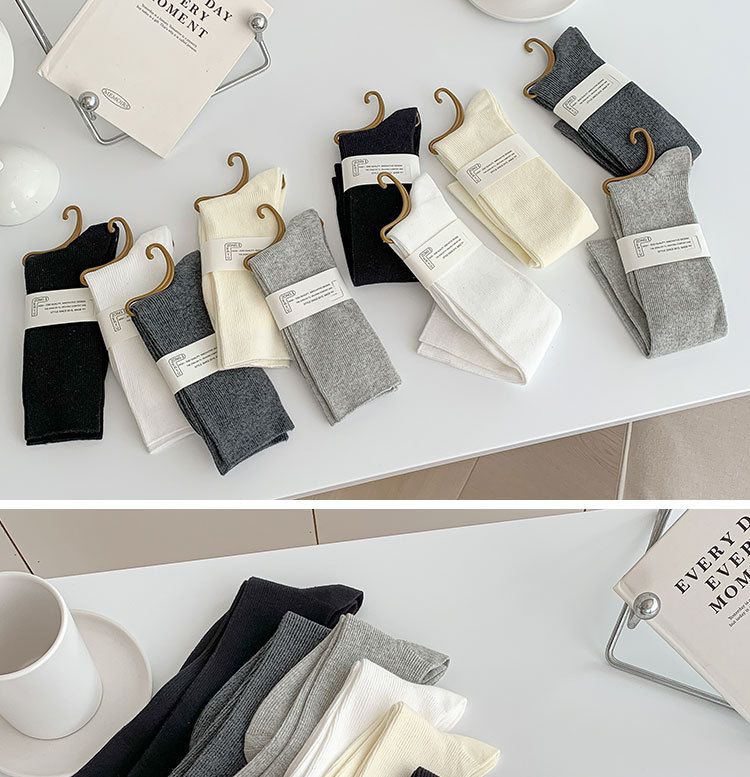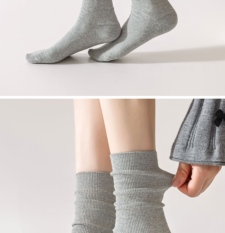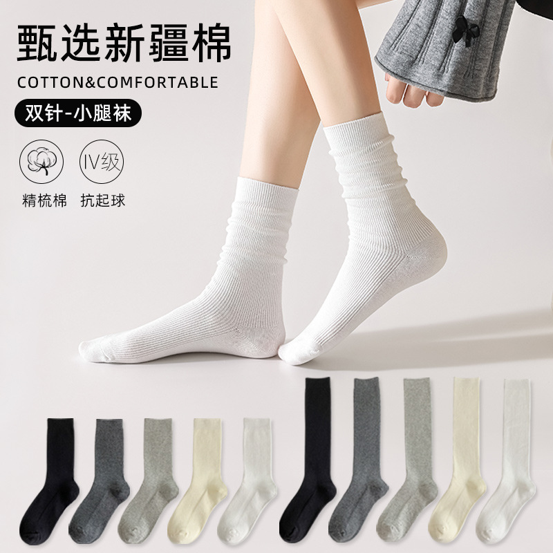 双针纯棉中筒袜子女士四季款JK长袜显瘦及膝小腿袜黑白灰色堆堆袜