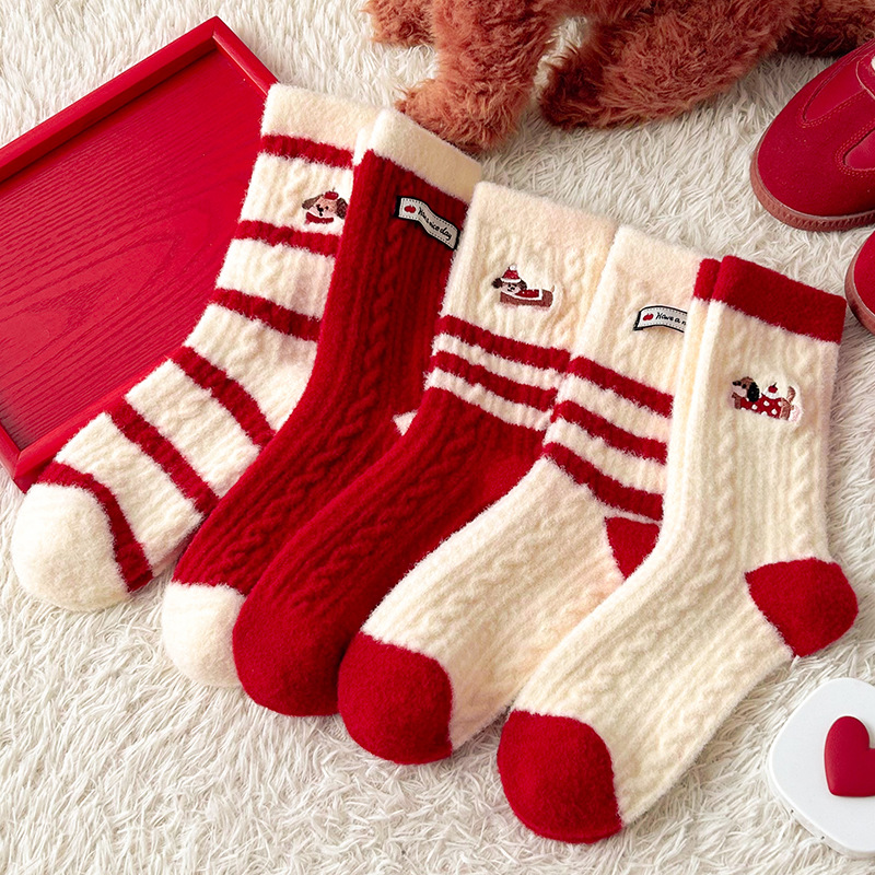 秋冬澳绒袜子女加厚保暖加绒软软糯糯本命年韩版新年袜大红地板袜