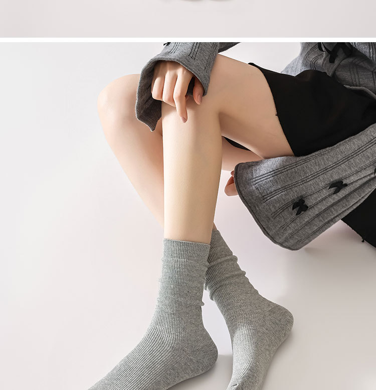 灰色袜子女纯棉中筒袜秋冬季刺绣可爱卡通蝴蝶结全棉双针无骨长袜
