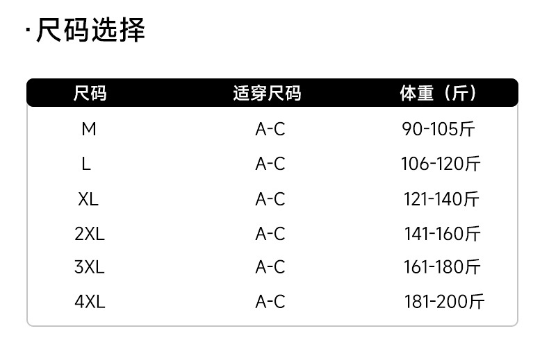 尺码 M(90-105斤),L(106-120斤),XL(121-140斤),XXL(141-160斤),3XL(161-180斤),4XL(181-200斤)