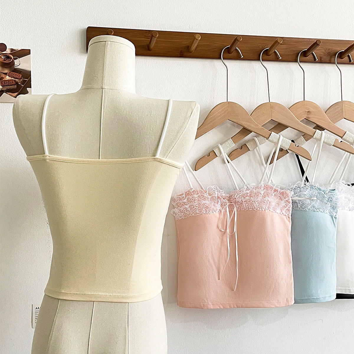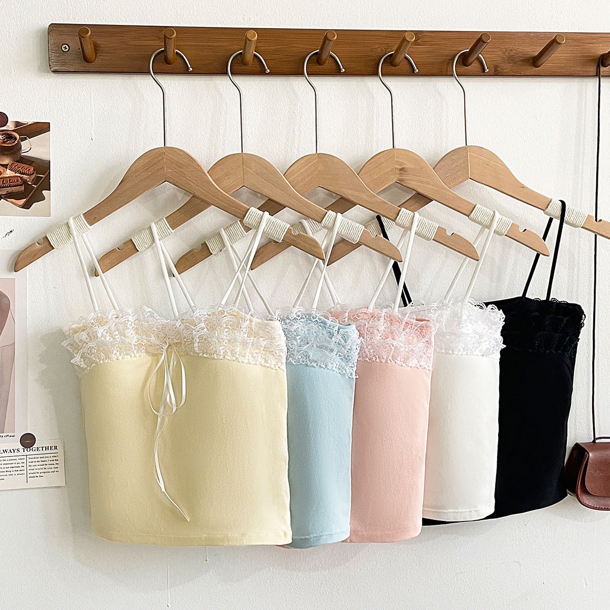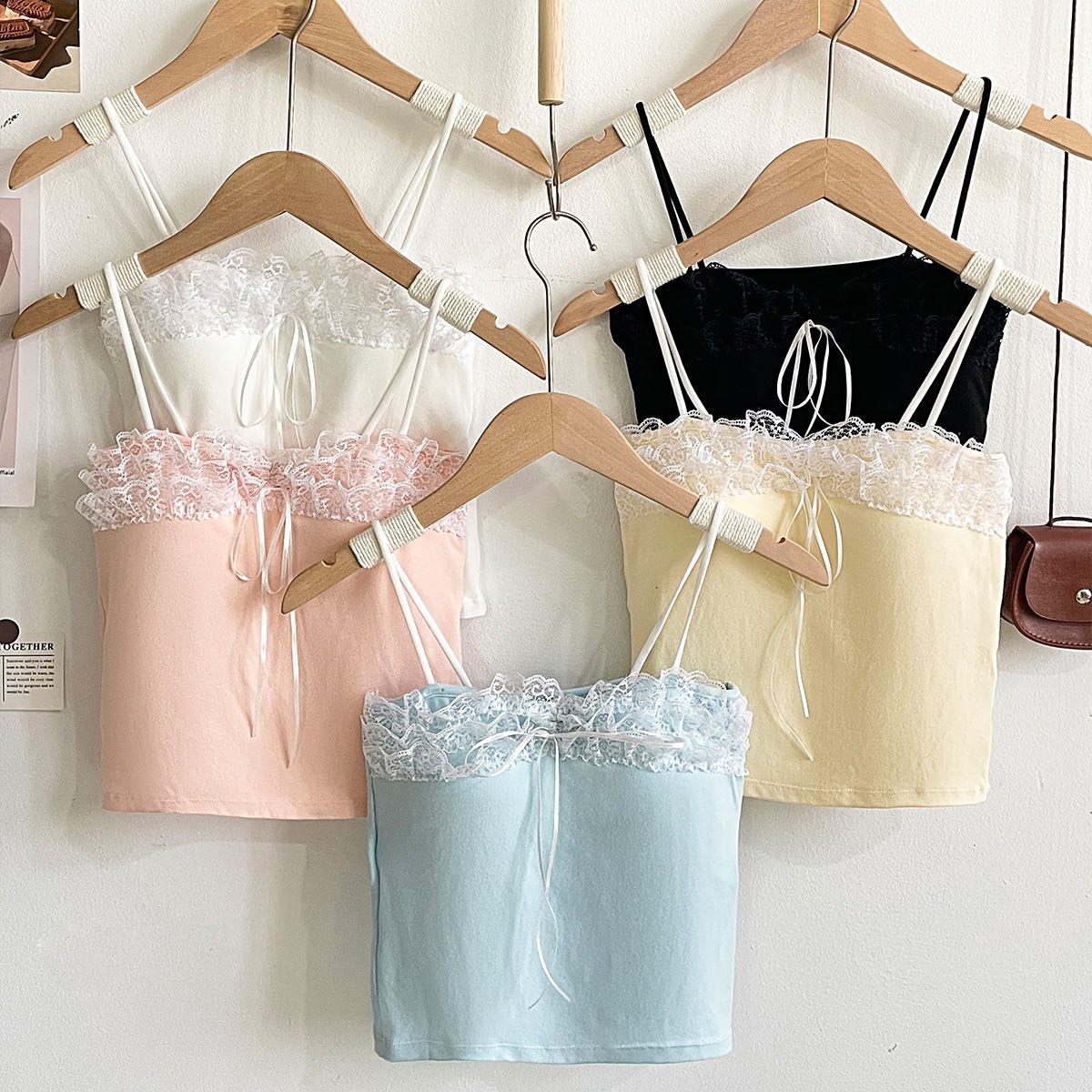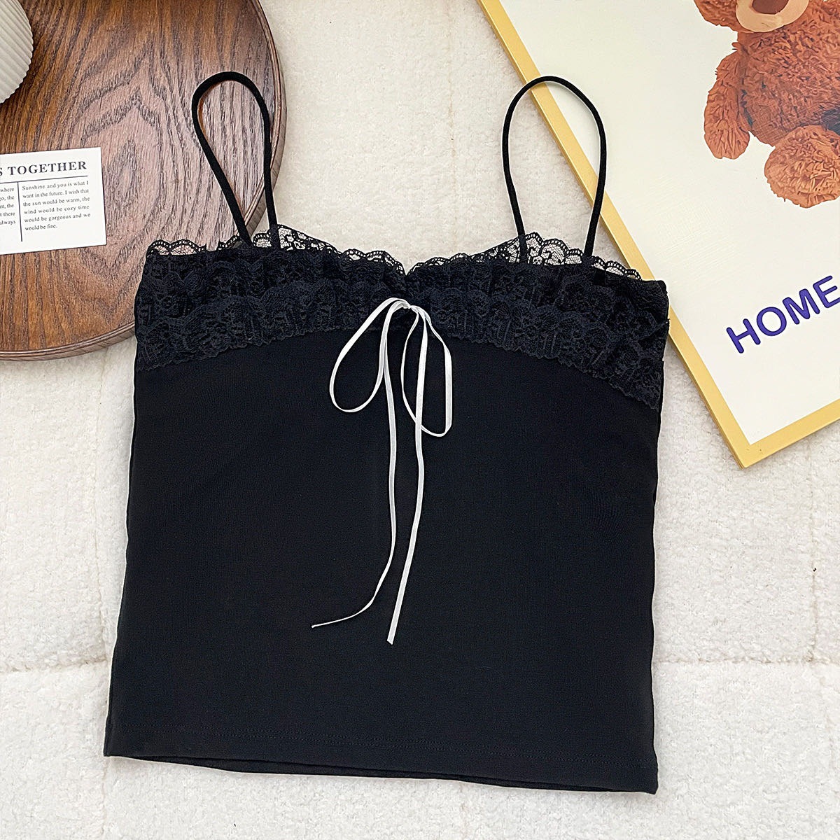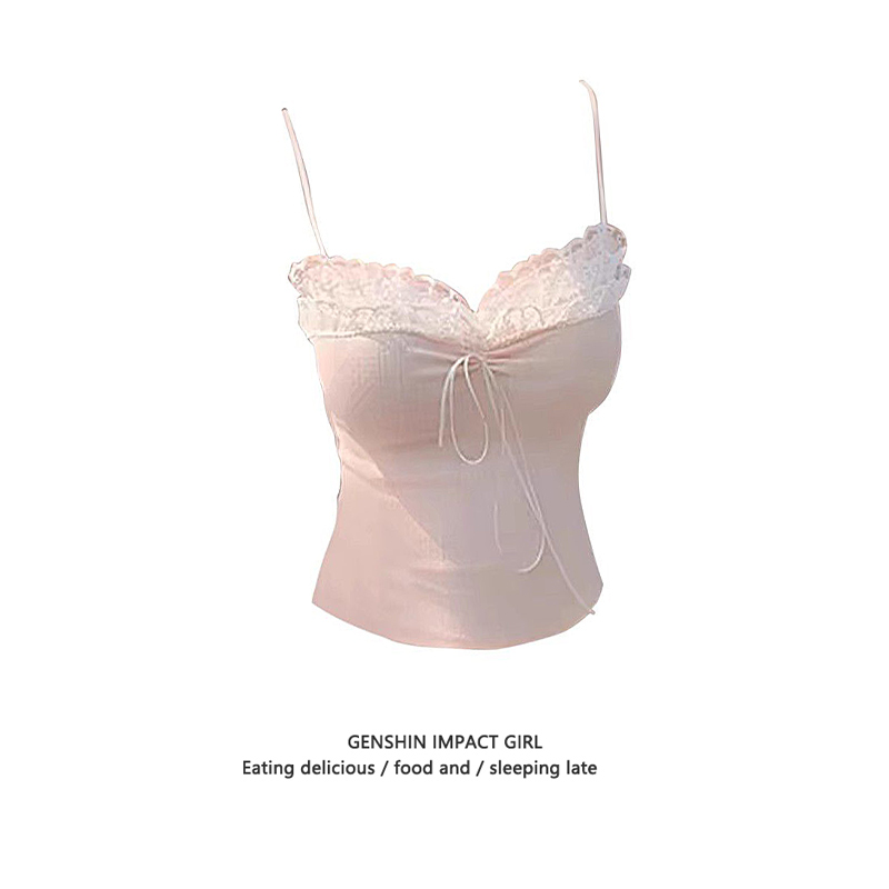 韓国の甘いレイヤードキャミソールレディースサマーデザインレースステッチレースアップスリムボトムシャツトップ