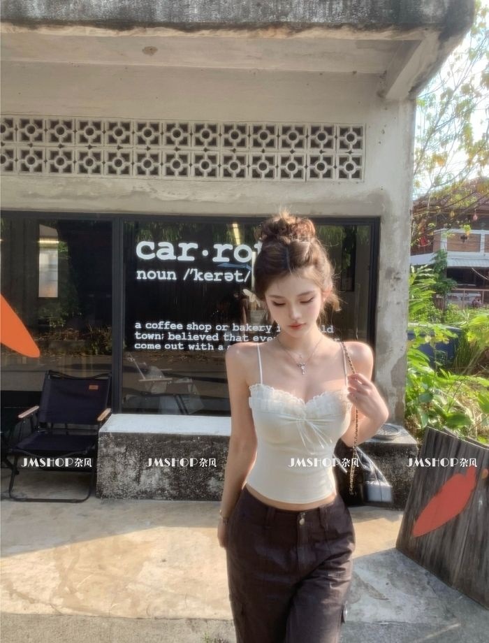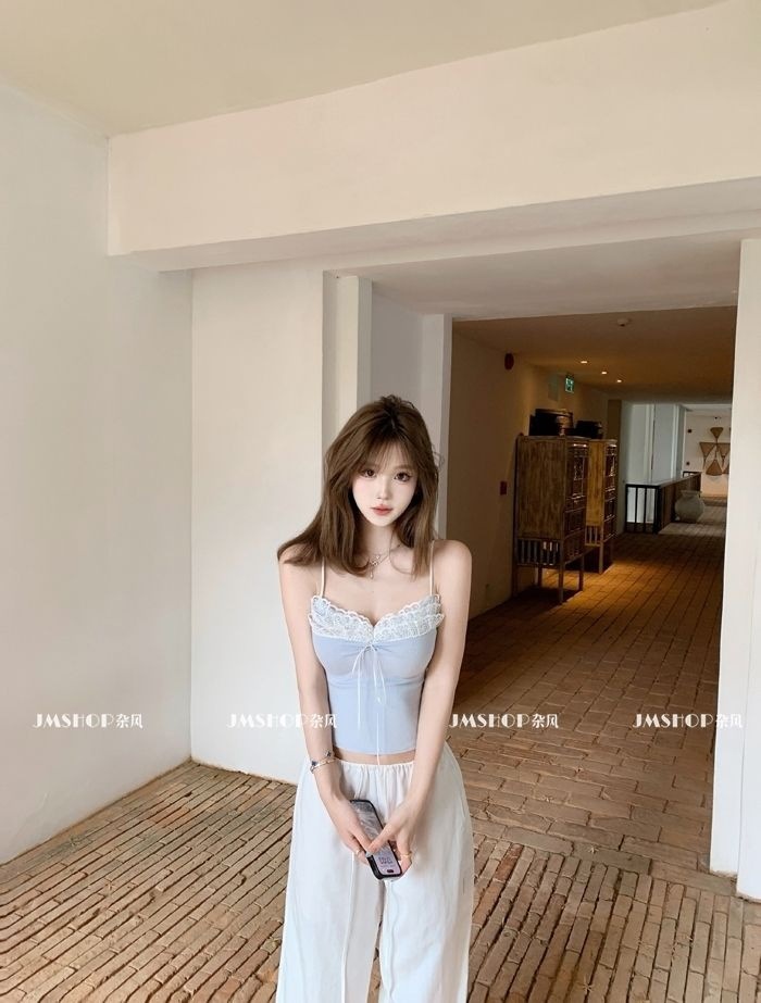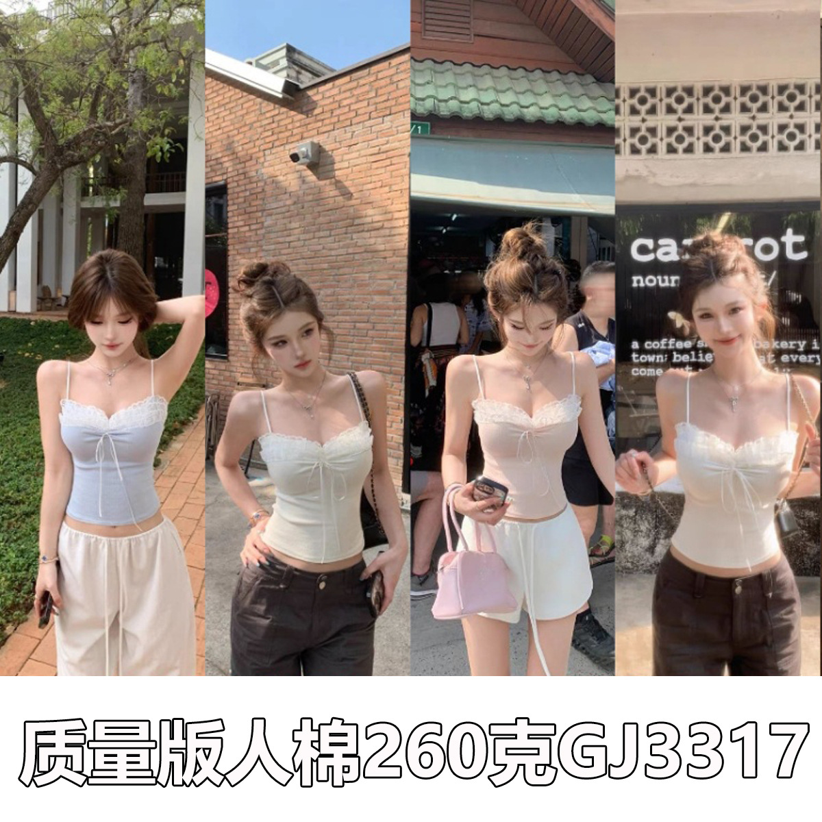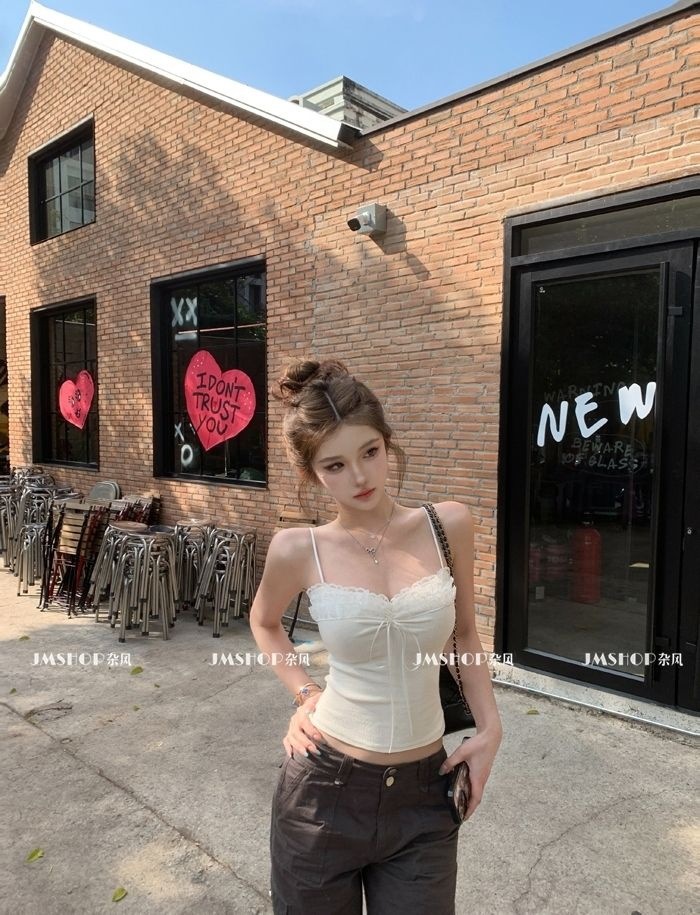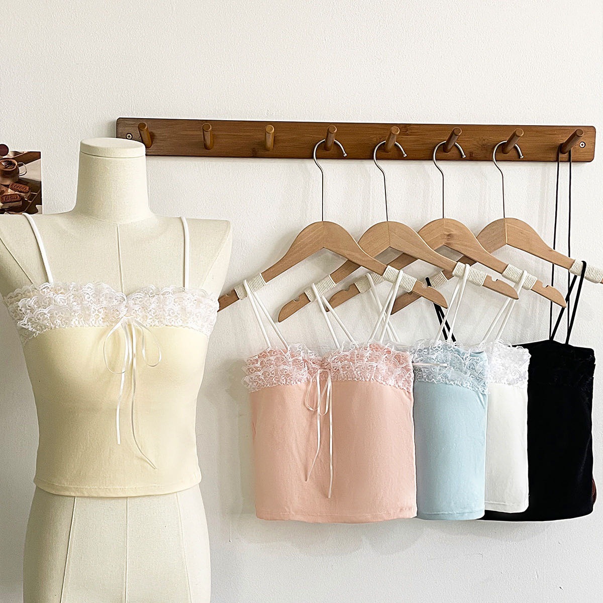 韓国の甘いレイヤードキャミソールレディースサマーデザインレースステッチレースアップスリムボトムシャツトップ
