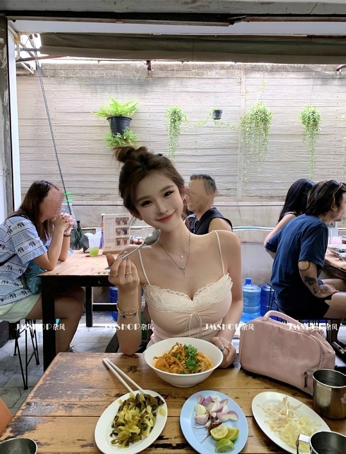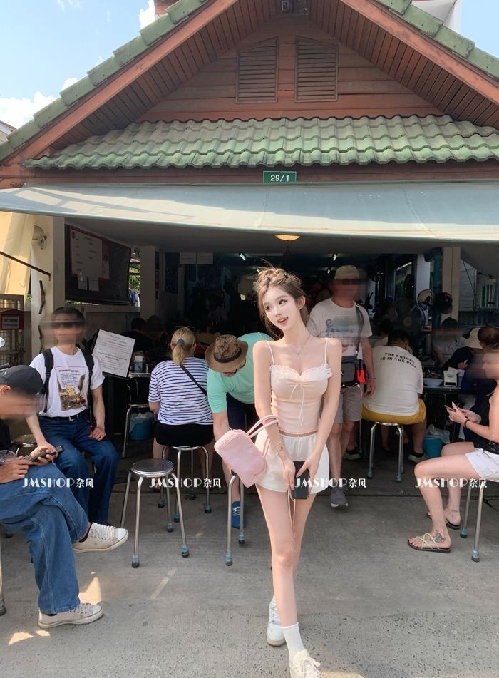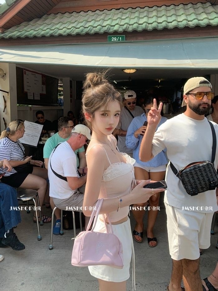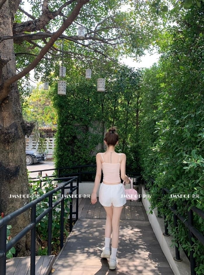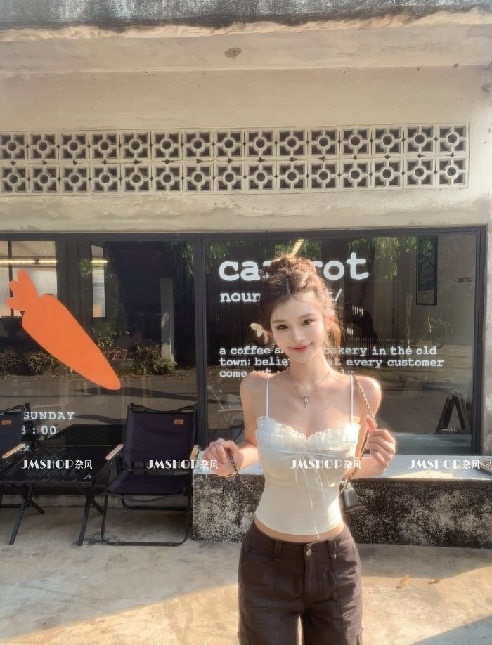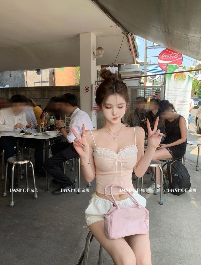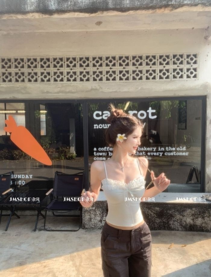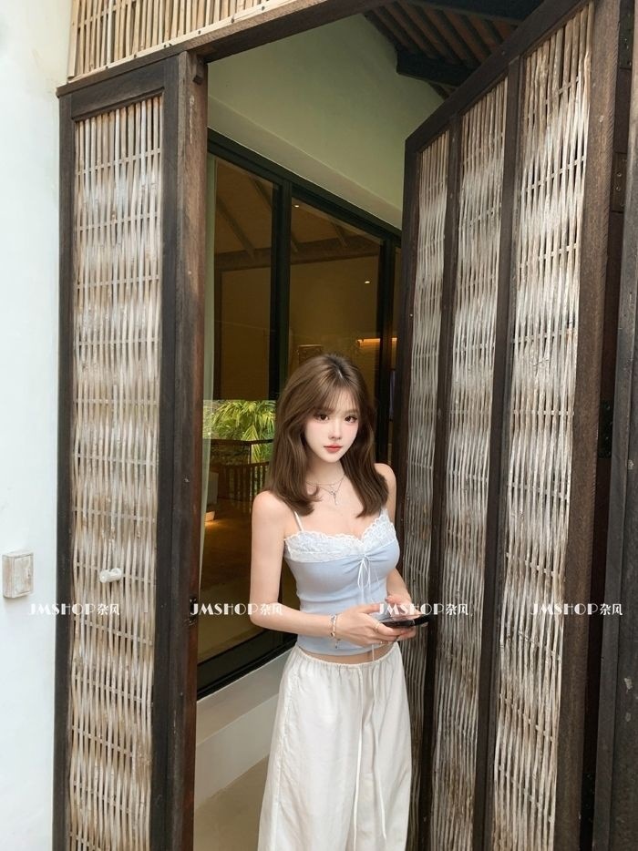 韓国の甘いレイヤードキャミソールレディースサマーデザインレースステッチレースアップスリムボトムシャツトップ