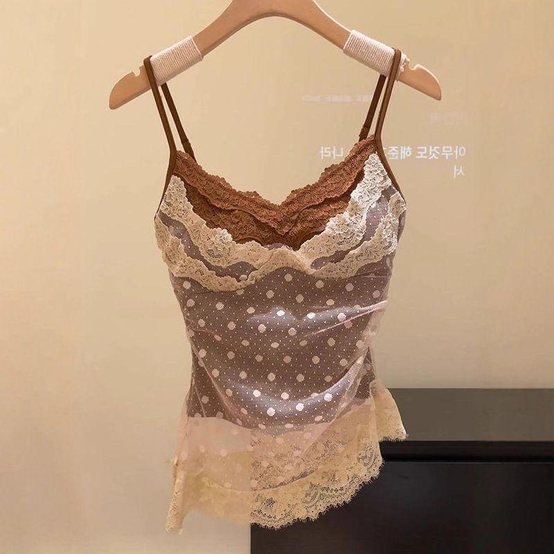 レトロな水玉レース偽ツーピースレースキャミソール女性の夏の新しいノースリーブアウターホットガールインナートップ