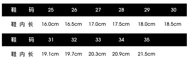 尺码 25 内长16.0cm,26 内长16.5cm,27 内长17.0cm,28 内长17.5cm,29 内长18.0cm,30 内长18.5cm,31 内长19.1cm,32 内长19.7cm,33 内长20.3cm,34 内长20.9cm,35 内长21.5cm