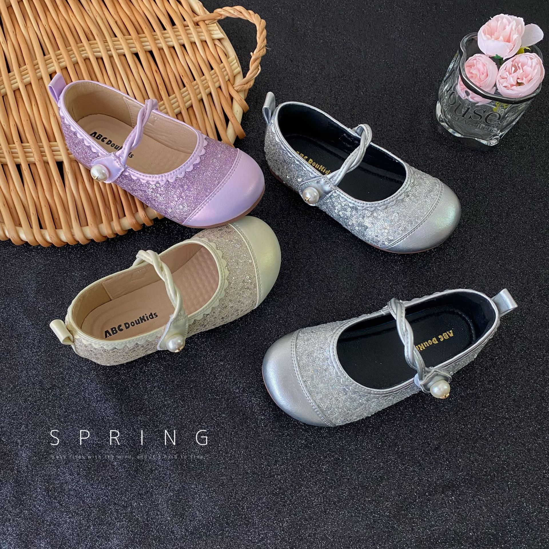 女の子の靴2025春の新しい子供の靴の女の子の王女の靴の柔らかい底の人魚姫珠光の赤ちゃんの靴