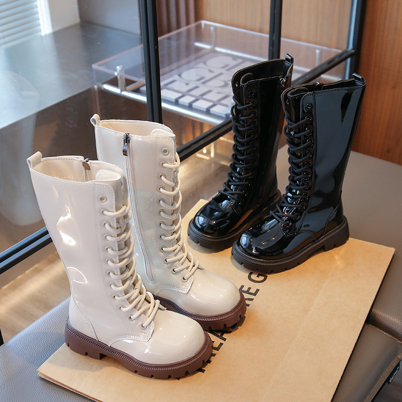 女の子のファッションの明るい皮のブーツ2023秋冬の韓国版の女の子の後でファスナーのファッションのズボンの管の靴の中で大きい子供は穴の靴を歩きます。