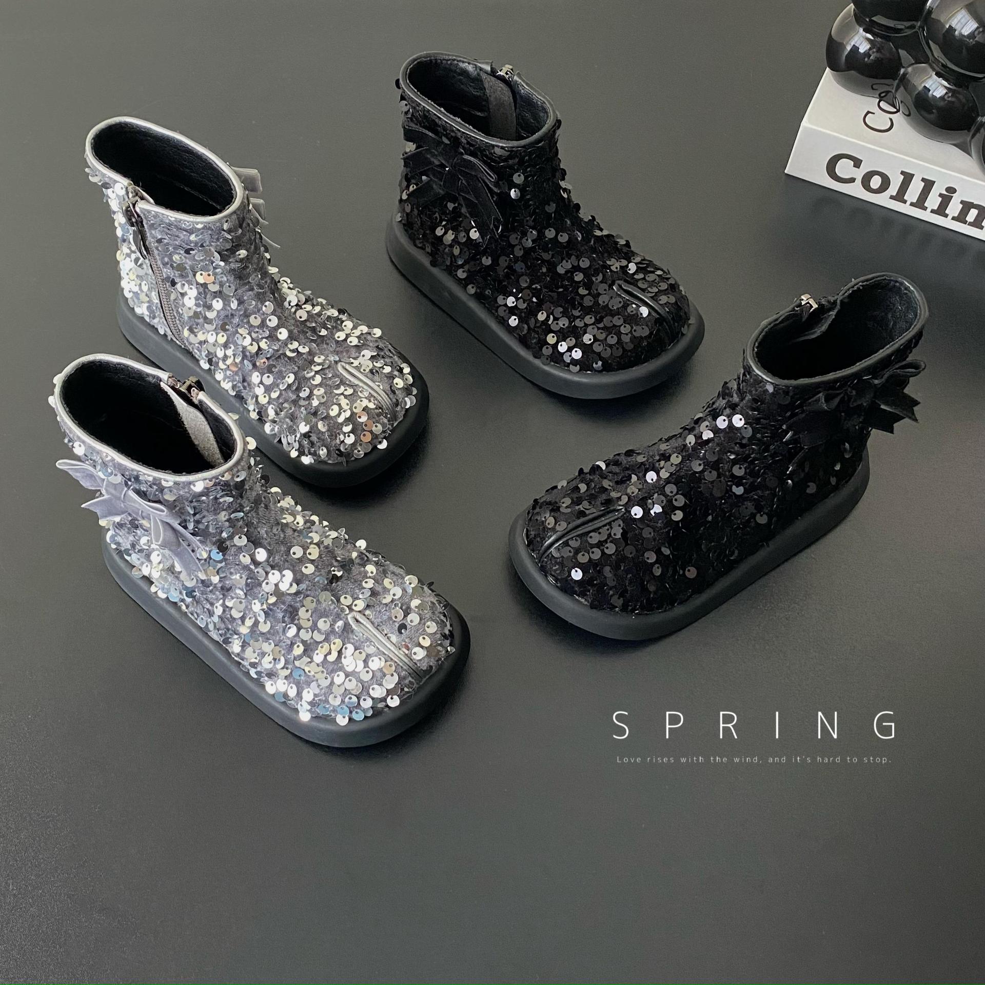 女の子用ブーツ2024秋冬新作ショートブーツファッションスパンコールプリンセスシューズ女宝コンビネーションソフトソール靴シルバー