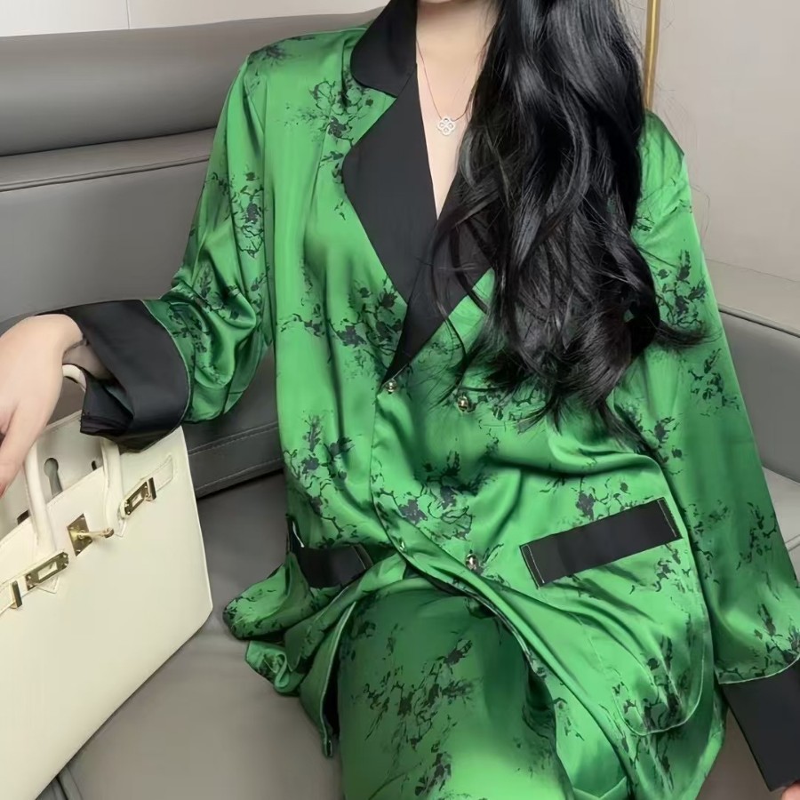 2025 新しい高精細パジャマ女性のファッショナブルで雰囲気のあるプリントアイスシルクハイセンスライト高級ホームウェアセット
