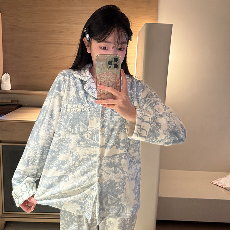 网红爆款D家系列海岛绒睡衣女秋冬季蓝色显白珊瑚绒保暖家居服
