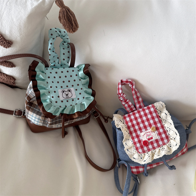 儿童背包洋气格子男女童抽绳双肩包甜美蕾丝花边可爱波点宝宝书包